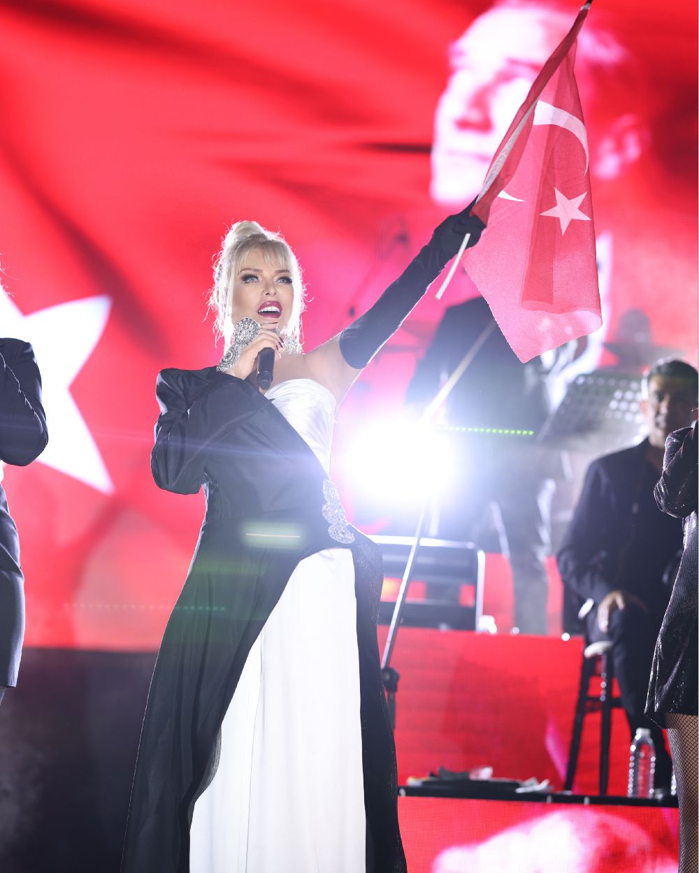 On binlerce müzikseverin yoğun katılımıyla gerçekleştirilen konserde, Süperstar Türk Bayrağı ile sahneye çıktı. Sahnede şıklığı ile de göz kamaştıran Süperstar, Modacı Züleyha Kuru imzalı siyah beyaz bir kostüm tercih etti.