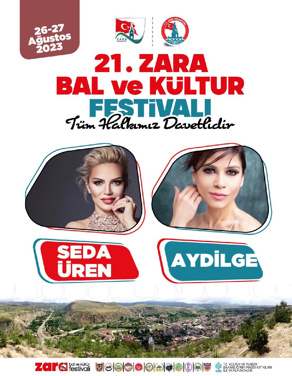 Festivalin ilk gününde Özcan Türe, Cihat Yaman ve Zabit Karaman konser verirken ikinci ve son ise Sivas’ın sevilen ozanı Kubilay Dökmetaş, sonrasında ise ünlü sanatçılar Seda Üren ve Aydilge’de sahneye çıkacak.. Renkli festivalde ayrıca Türk dünyası halk oyunları gösteri ekipleri, yöresel kıyafetlerini yansıtan Nilgül'ün bebekleri, Zaralı yazarların söyleşileri ve meşhur Zara balları görücüye çıkacak.