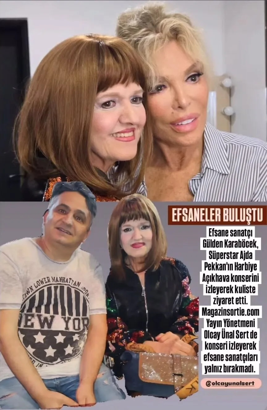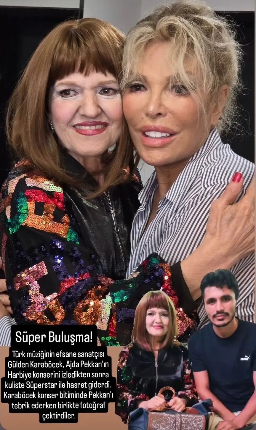 Türk müziğinin efsane sanatçısı Gülden Karaböcek, Ajda Pekkan'ın Harbiye konserini izledikten sonra kuliste Süperstar ile hasret giderdi. Karaböcek konser bitiminde Pekkan'ı tebrik ederken birlikte fotoğraf çektirdiler.