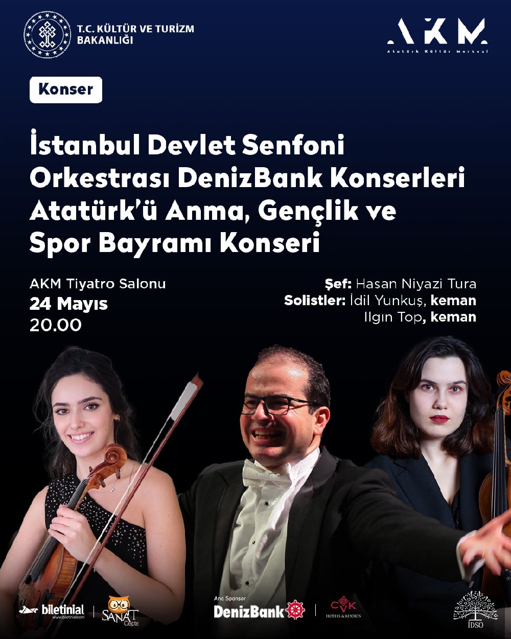 İstanbul Devlet Senfoni Orkestrası, 24 Mayıs'ta saat 20.00'de “Atatürk'ü Anma ve Gençlik ve Spor Bayramı” konseri AKM Tiyatro Salonunda dinleyicisiyle buluşacak. Orkestrayı şef Hasan Niyazi Tura yönetecek, İdil Yunkuş ve Ilgın Top solist olarak sahnede yer alacak. Programda P.I. Tchaikovsky'nin “Re Majör Op.35 Keman Konçertosu” ve ardından I. Stravinsky'nin “Re Majör Keman Konçertosu No:1” seslendirilecek.