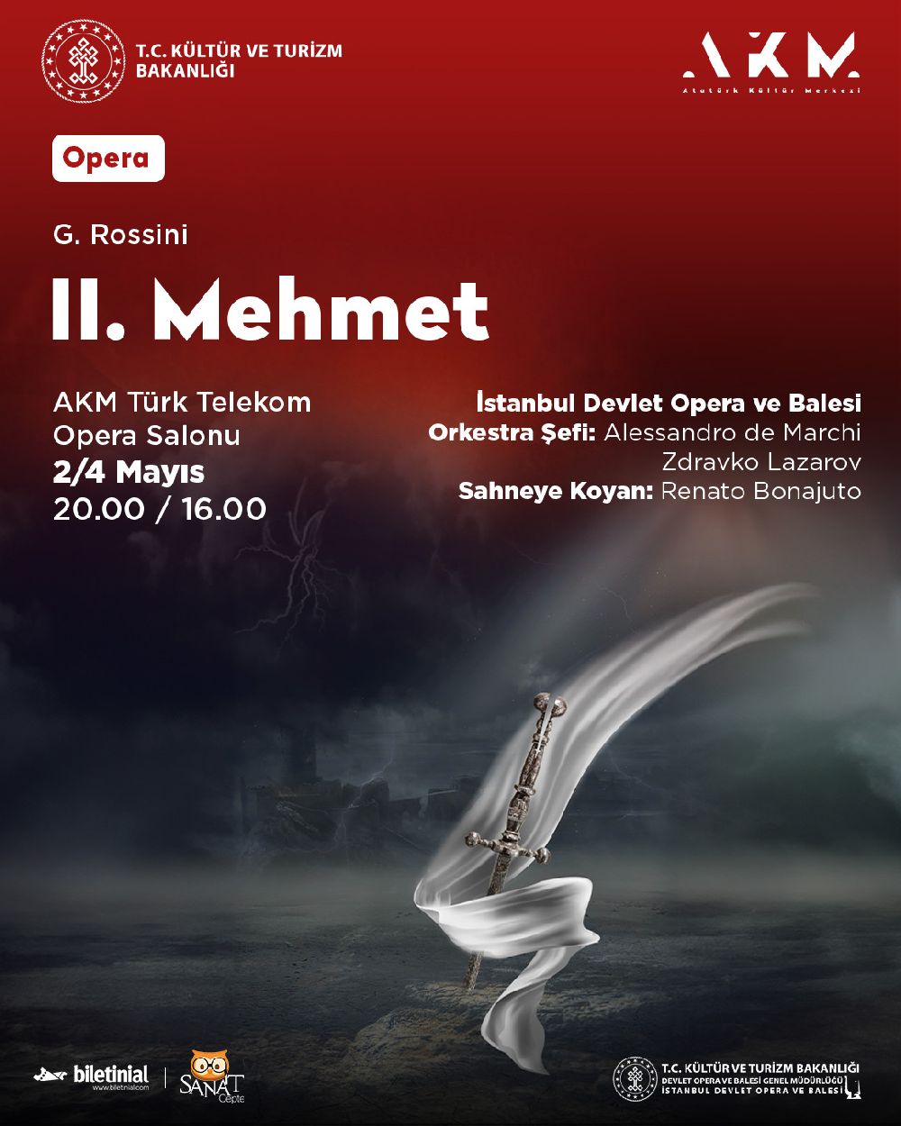 İstanbul Devlet Opera ve Balesi tarafından sahneye konan, 24 Şubat’ta prömiyeri gerçekleştirilen, G.Rossini’nin ünlü eseri “II Mehmet” ( Maometto II), 2-4 Mayıs tarihlerinde Türk Telekom Opera Salonunda izleyiciyle buluşmaya devam edecek. Osmanlı İmparatorluğu’nun yedinci padişahı Fatih Sultan Mehmet’in aşk hikayesini konu alan ve 34 yıl aradan sonra ilk kez AKM’de kendi dilinde, İtalyanca olarak seslendirilen eserin başrollerini Burak Bilgili, Zafer Erdaş (II.Mehmet), Dilruba Bilgi ve Gülbin Günay (Anna) paylaşıyor.