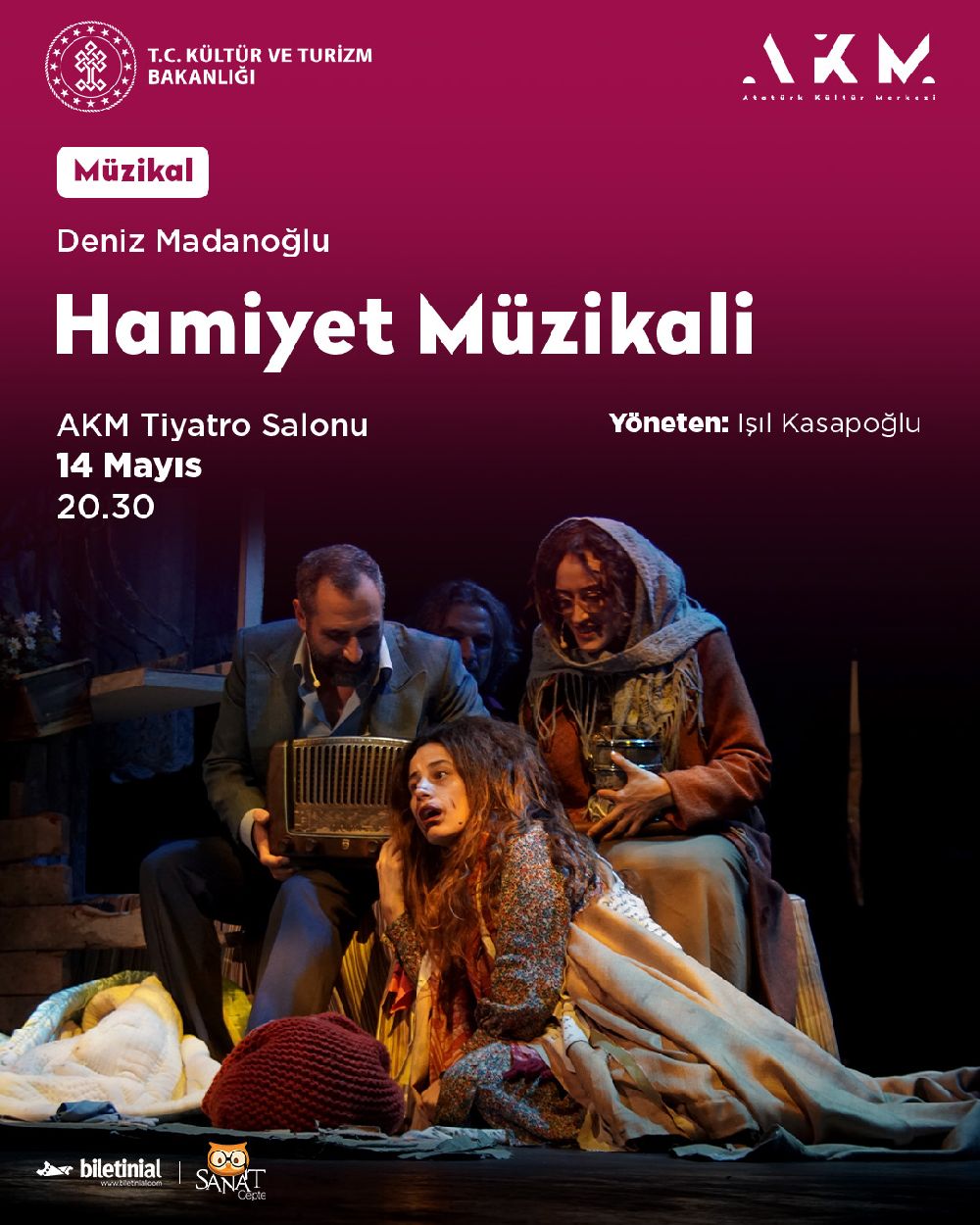 Deniz Madanaoğlu’nun yazdığı, yönetmenliğini Işıl Kasapoğlu’nun üstlendiği “Hamiyet” müzikali 14 Mayıs saat 20:30’da AKM Tiyatro Salonunda seyircisiyle buluşacak. Bir işçi mahallesinde eşi ve iki kızıyla mutlu sakin bir hayat sürdüren Hamiyet’in 1980 darbesiyle hayatının alt üst olmasını anlatan oyunun müzikal hikayesi ve şarkı sözleri Peyk grubunun solisti İrfan Alış tarafından yapıldı. Aslı İnandık’ın başrolde olduğu “Hamiyet” müzikalinde Bilgesu Kural, Cansu Bahadır, Esra Kızıldoğan, Ezgi Çelik, Sabahattin Yakut, Sermet Yeşil, Uygar Özçelik rol alıyor, Peyk grubu ise müzikleriyle eşlik ediyor.