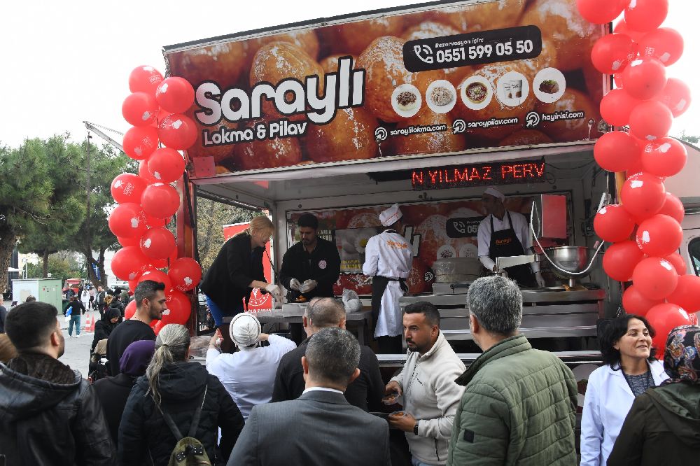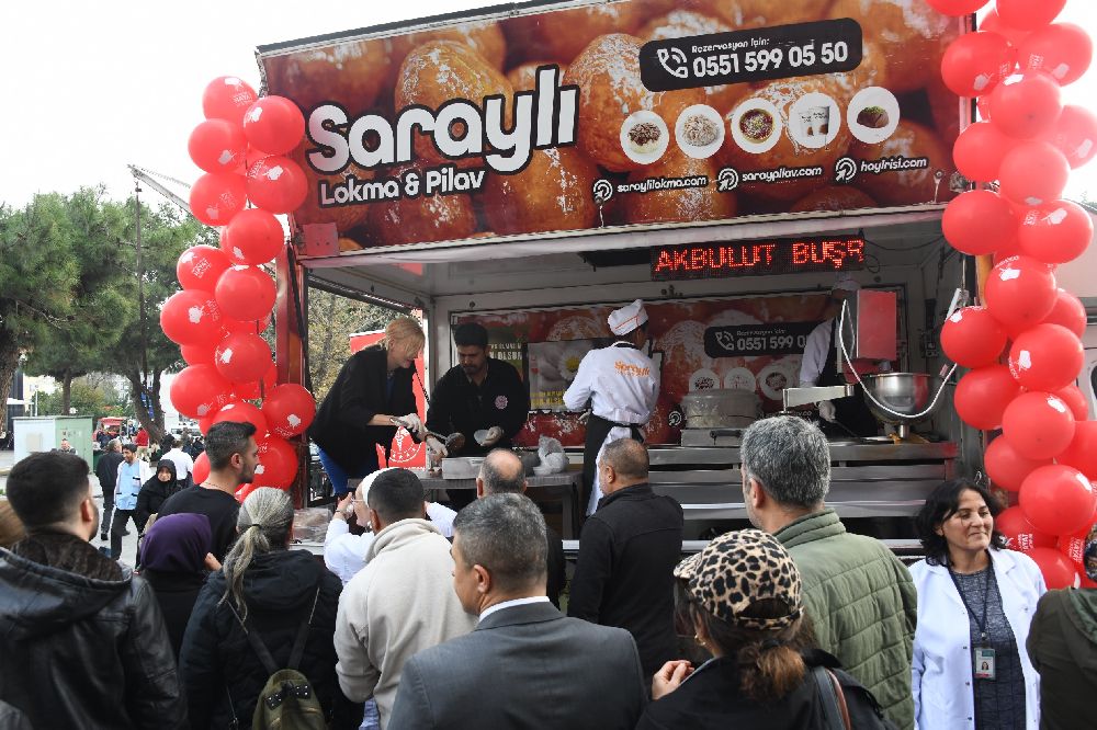 Elles ve Özmen, vatandaşlara lokmaları tek tek dağıtırken, hayranlarının fotoğraf isteklerini de kırmadı.