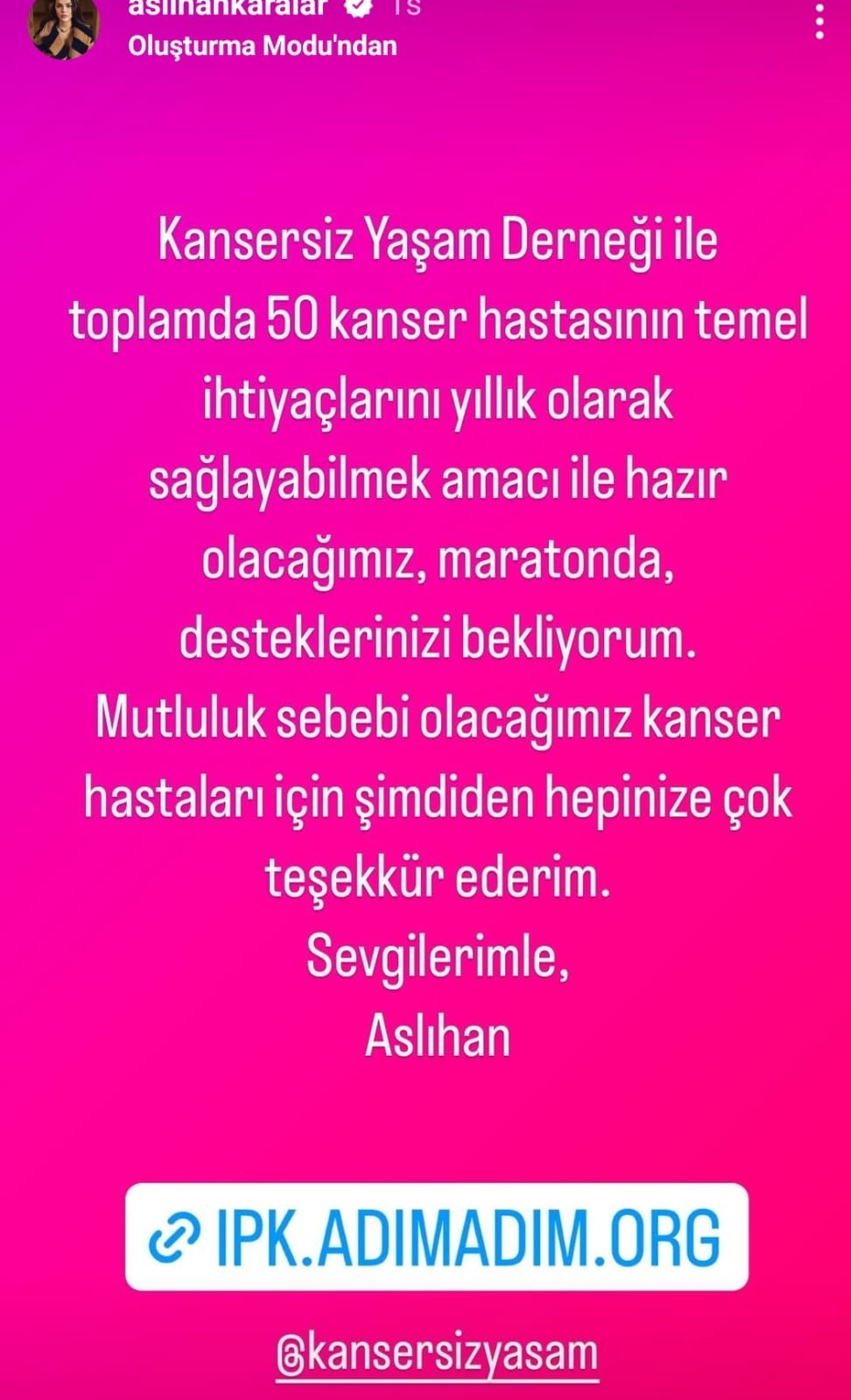 Aslıhan Karalar, sosyal medya hesabından yaptığı paylaşımda “Kansersiz Yaşam Derneği ile toplamda 50 kanser hastasının temel ihtiyaçlarını yıllık olarak sağlayabilmek amacı ile hazır olacağımız maratonda desteklerinizi bekliyorum. Mutluluk sebebi olacağımız kanser hastaları için şimdiden hepinize çok teşekkür ederim. Sevgilerimle…” ifadelerini kullandı.