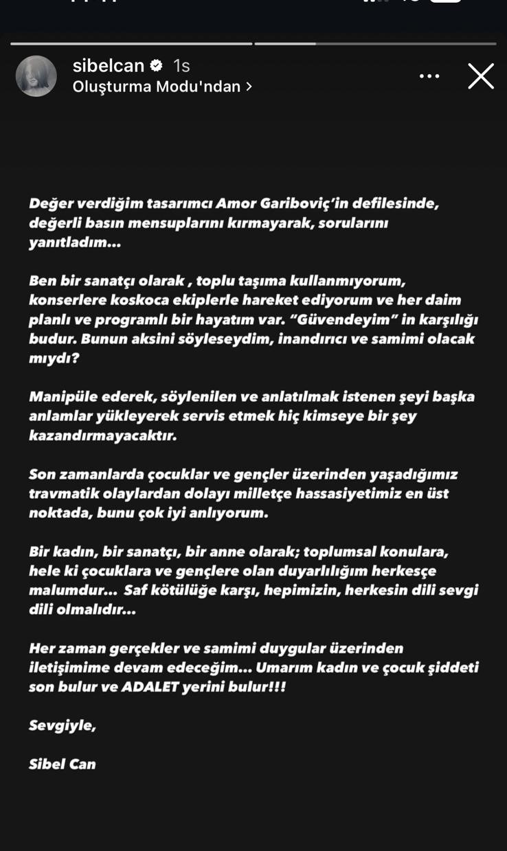 Can, "Değer verdiğim tasarımcı Amor Gariboviç’in defilesinde, değerli basın mensuplarını kırmayarak, sorularını yanıtladım. Ben bir sanatçı olarak , toplu taşıma kullanmıyorum, konserlere koskoca ekiplerle hareket ediyorum ve her daim planlı ve programlı bir hayatım var. ‘Güvendeyim’im karşılığı budur. Bunun aksini söyleseydim, inandırıcı ve samimi olacak mıydı? Manipüle ederek, söylenilen ve anlatılmak istenen şeyi başka anlamlar yükleyerek servis etmek hiç kimseye bir şey kazandırmayacaktır. Son zamanlarda çocuklar ve gençler üzerinden yaşadığımız travmatik olaylardan dolayı milletçe hassasiyetimiz en üst noktada, bunu çok iyi anlıyorum.