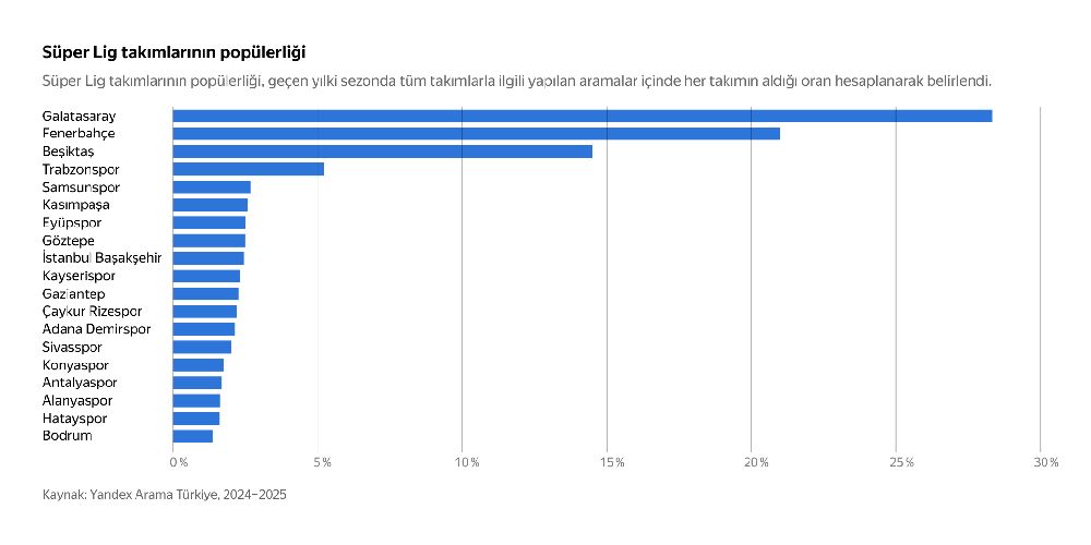 Yandex’in araştırmasında, geçen sezon Süper Lig maçlarıyla ilgili yapılan milyonlarca arama sorgusu incelendi. Aramalar, her maçın öncesi ve sonrasındaki iki günü kapsıyor ve çoğunlukla karşı karşıya gelen iki takımın adlarını içeriyor. Araştırma Türkiye’nin en büyük yirmi ilinin arama alışkanlıklarına odaklanıyor. Genel arama trendleri: Futbol kulüpleri Araştırmaya göre, şampiyonlukla ilgili aramaların %28’inde adı geçen Galatasaray Türkiye’nin en çok aranan takımı oldu. Fenerbahçe %21’lik oranla ikinci sırada yer alırken, Beşiktaş ise yüzde 14 ile üçüncü oldu.