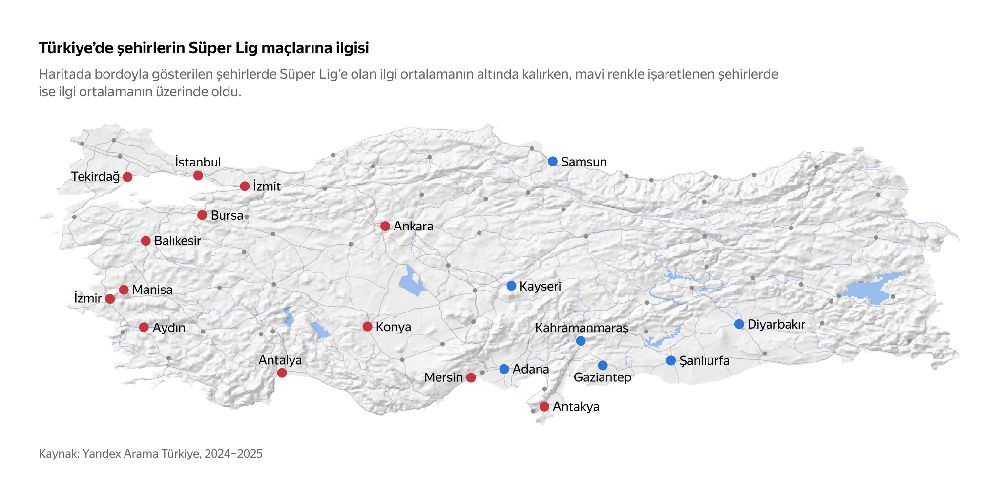 Örneğin Trabzonspor, Trabzon’a yakınlığı nedeniyle Samsun’da da çok fazla ilgi gördü. Kayseri’de ise Sivasspor ile ilgili aramalar ortalamayı aştı. Türkiye’de şehirlerin Süper Lig maçlarına ilgisi Sezon boyunca futbol içerikli aramaların en fazla yapıldığı şehir ise Diyarbakır oldu. Futbola en çok ilgi gösteren diğer iller ise sırasıyla Şanlıurfa ve Gaziantep olarak öne çıktı.