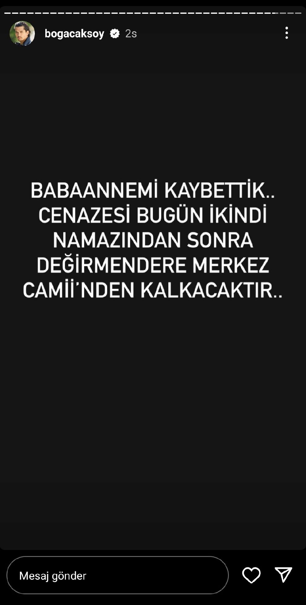 Ünlü oyuncu Boğaç Aksoy’un babaannesi Nurten Aksoy, hayatını kaybetti. Ünlü oyuncu, acı haberi sosyal medya hesabında duyurdu.