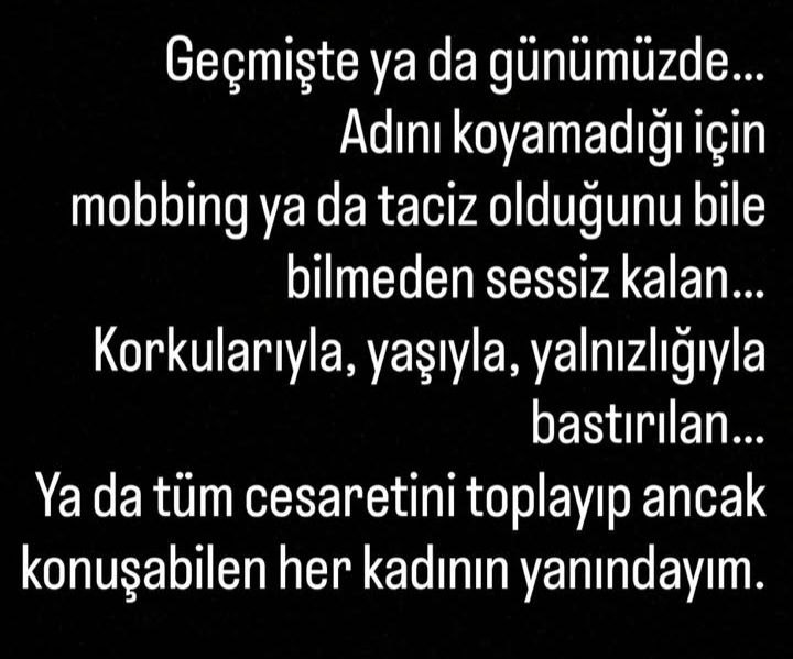 Terzioğlu, "Geçmişte ya da günümüzde... Adını koyamadığı için mobbing ya da taciz olduğunu bile bilmeden sessiz kalan... Korkularıyla, yaşıyla, yalnızlığıyla bastırılan... Ya da tüm cesaretini toplayıp ancak konuşabilen her kadının yanındayım" dedi.