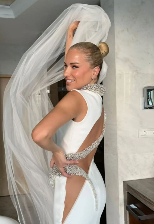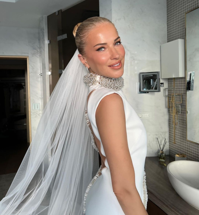 İtalya'da 3 gün süren düğün yapan çift, İstanbul'da arkadaşlarıyla bir etkinlik daha düzenledi. Esmersoy, düğününde bu sefer kalça dekolteli bir gelinlik giydi.