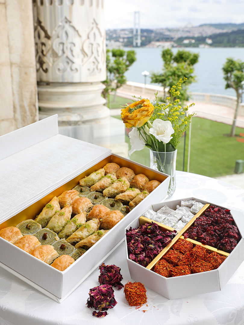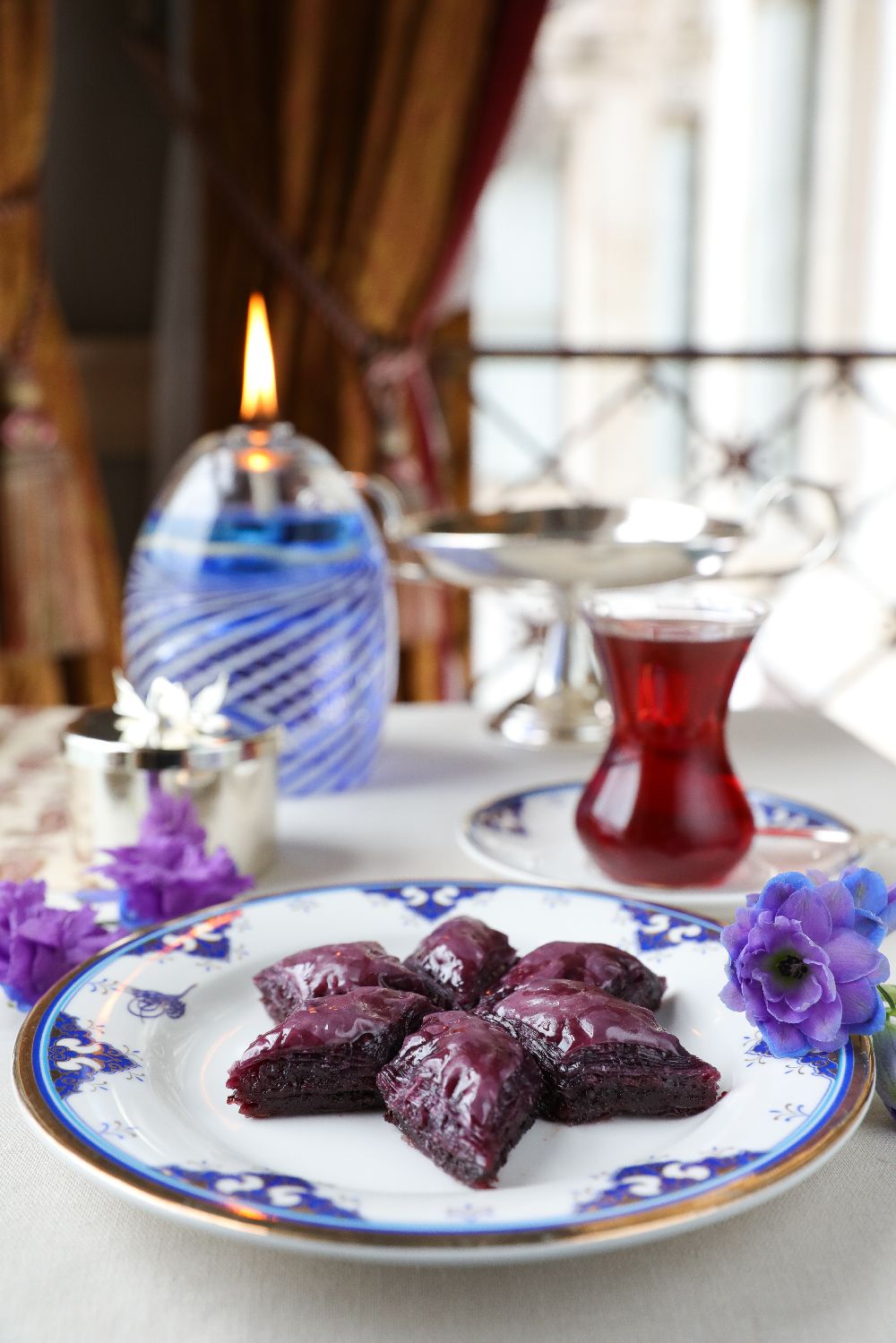 Çırağan Sarayı’nın içinde, sadece baklava üretimine özel ayrılan odada, Gaziantep’ten gelen baklava ustaları tarafından titizlikle üretilen baklavalar, damaklarda muhteşem bir haz yaşatıyor. Fıstıklısından şöbiyetine, çikolatalısından kahvelisine, klasik ve modern dokunuşlarla birçok farklı seçenekte baklavalar, ağızlarda dağılan muhteşem lezzetiyle büyülüyor. Bu lezzetler arasında öne çıkan, geleneksel tatlı kültürünü modern bir dokunuşla yeniden yorumlayan Vişneli Mor Baklava, hem görsel hem de damak zevki açısından kendine özgü bir fark yaratıyor. Antosiyanin bakımından zengin kırmızı ve mor renkli besinler ve ileri teknoloji kullanılarak saflaştırılan içeriklerle hazırlanan bu yenilikçi tatlı, alışılmışın ötesinde bir lezzet deneyimi sunuyor. Vişneli Mor Baklava, ferah ve unutulmaz bir tat keşfi vadediyor.