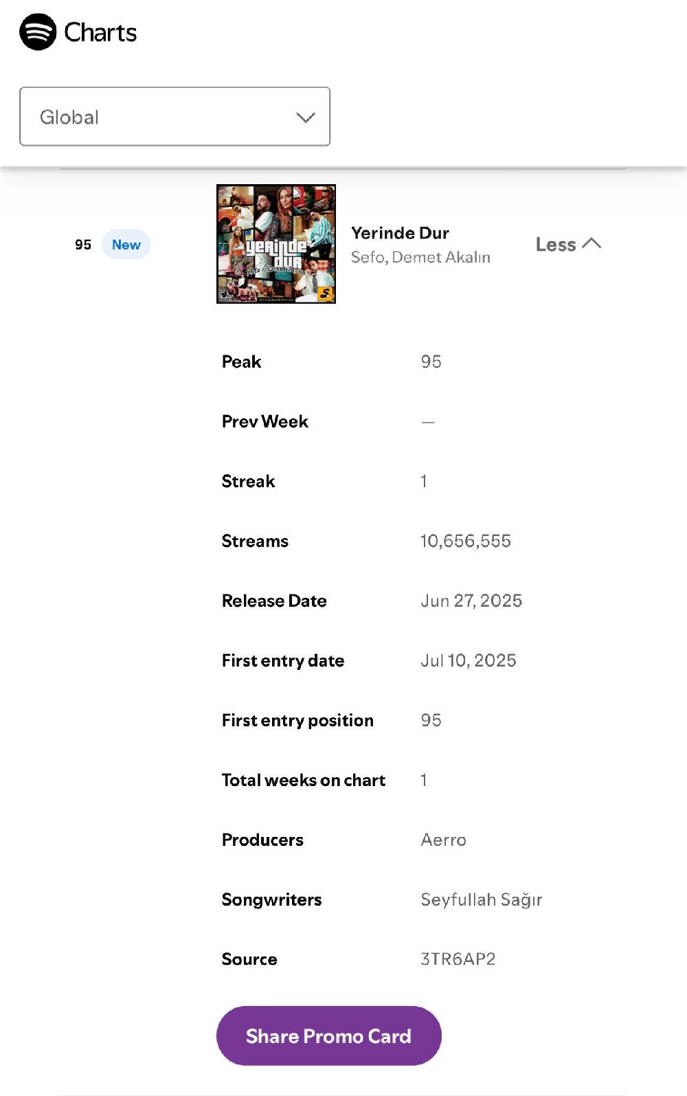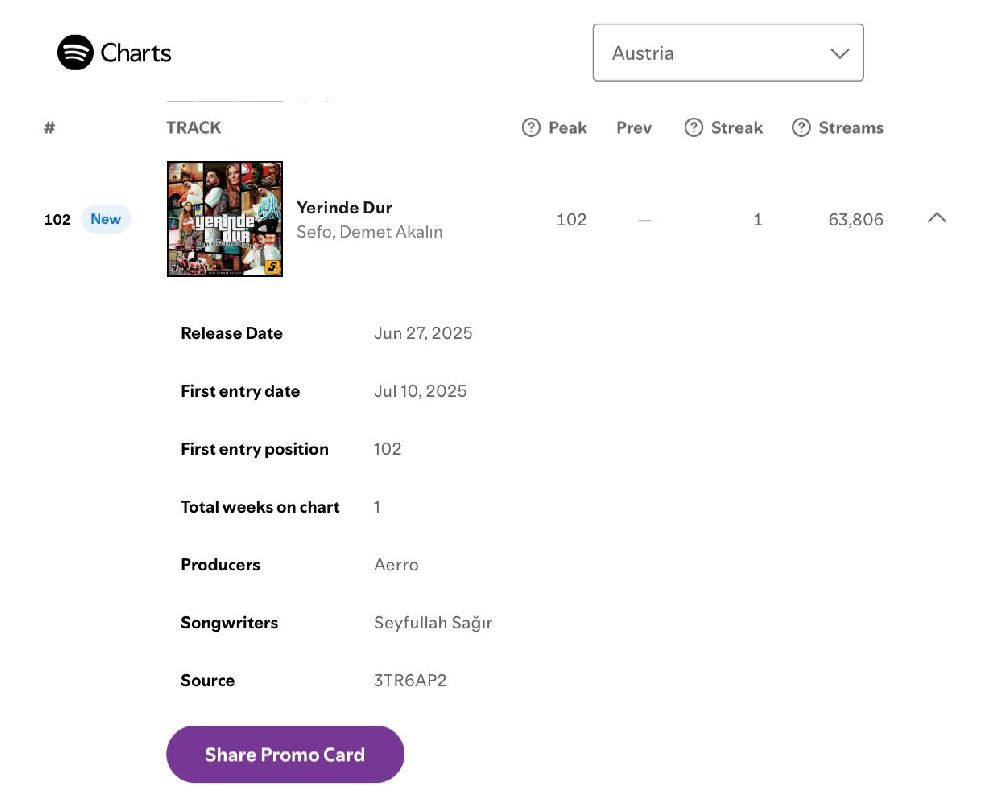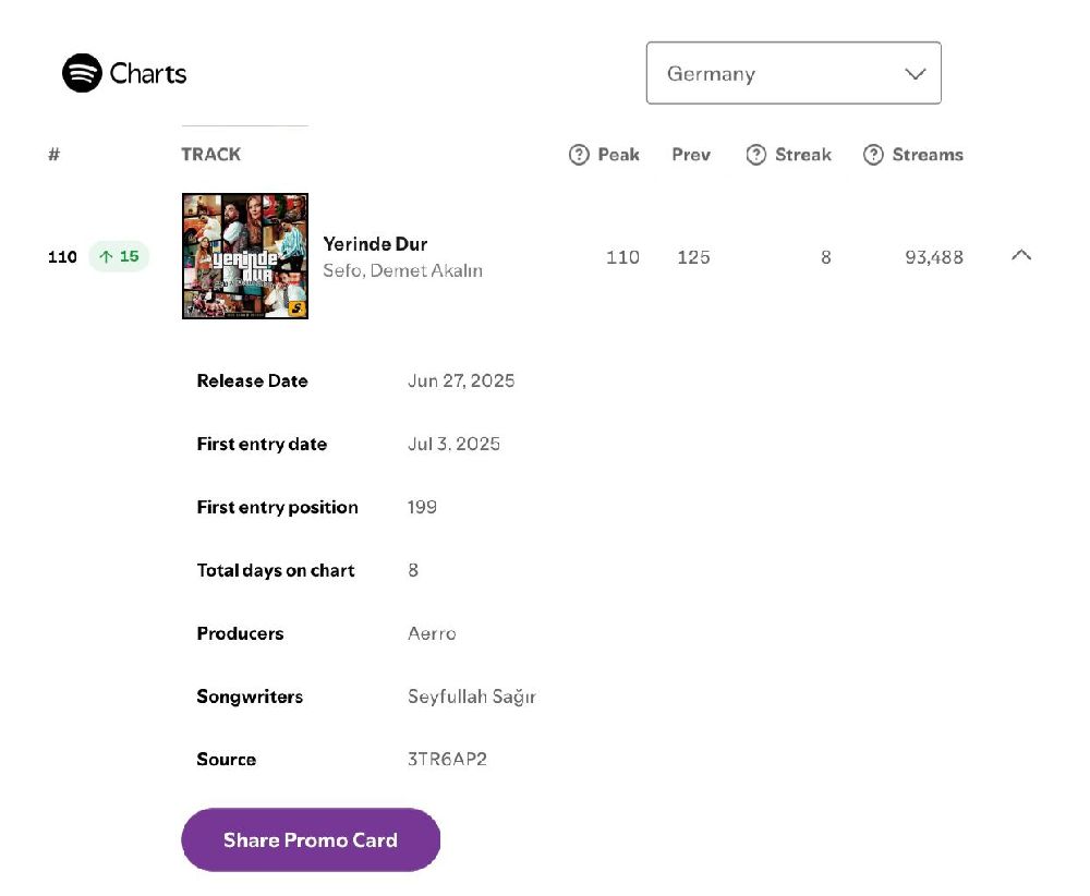 Şarkı, yayınlandığı gün Spotify Türkiye Top 50 listesine 2 numaradan etkileyici bir giriş yaparken, Spotify Global Top 100 listesinde ise 3. sıraya yükselerek küresel bir hit olduğunu kanıtladı.
