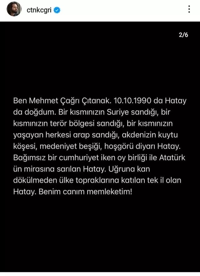 Ben Mehmet Çağrı Çıtanak. 10.10.1990'da Hatay'da doğdum. Bir kısmınızın Suriye sandığı, bir kısmınızın terör bölgesi sandığı, bir kısmınızın yaşayan herkesi Arap sandığı, Akdeniz'in kuytu köşesi, medeniyet beşiği, hoşgörü diyarı Hatay. Bağımsız bir cumhuriyet iken oy birliği ile Atatürk'ün mirasına sarılan Hatay. Uğruna kan dökülmeden ülke tokpraklarına katılan tek il olan Hatay. Benim canım memleketim!