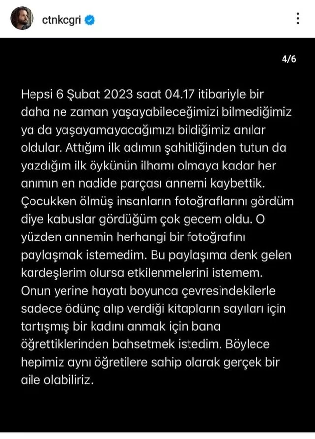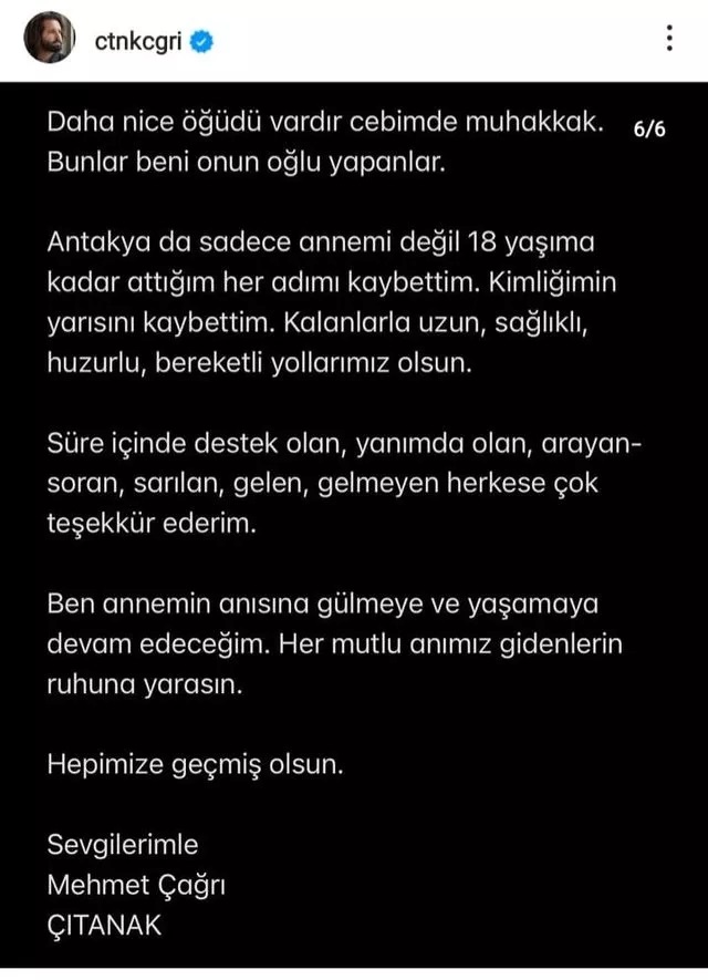 Yüzlerce binanın yıkıldığı Hatay'da arama kurtarma çalışmalarına devam ediliyor. Oyuncu Çağrı Çıtanak'ın annesi Nevber Yurdal Çıtanak, Hatay'da yaşanan elim deprem faciasında hayatını kaybeden vatandaşlardan biri. Genç oyuncu, annesinin kaybı sonrasında yaşadıklarını ve hissettiklerini Instagram hesabı üzerinden bir yazıyla paylaştı. Oyuncunun paylaşımı okuyanları bir hayli duygulandırdı.