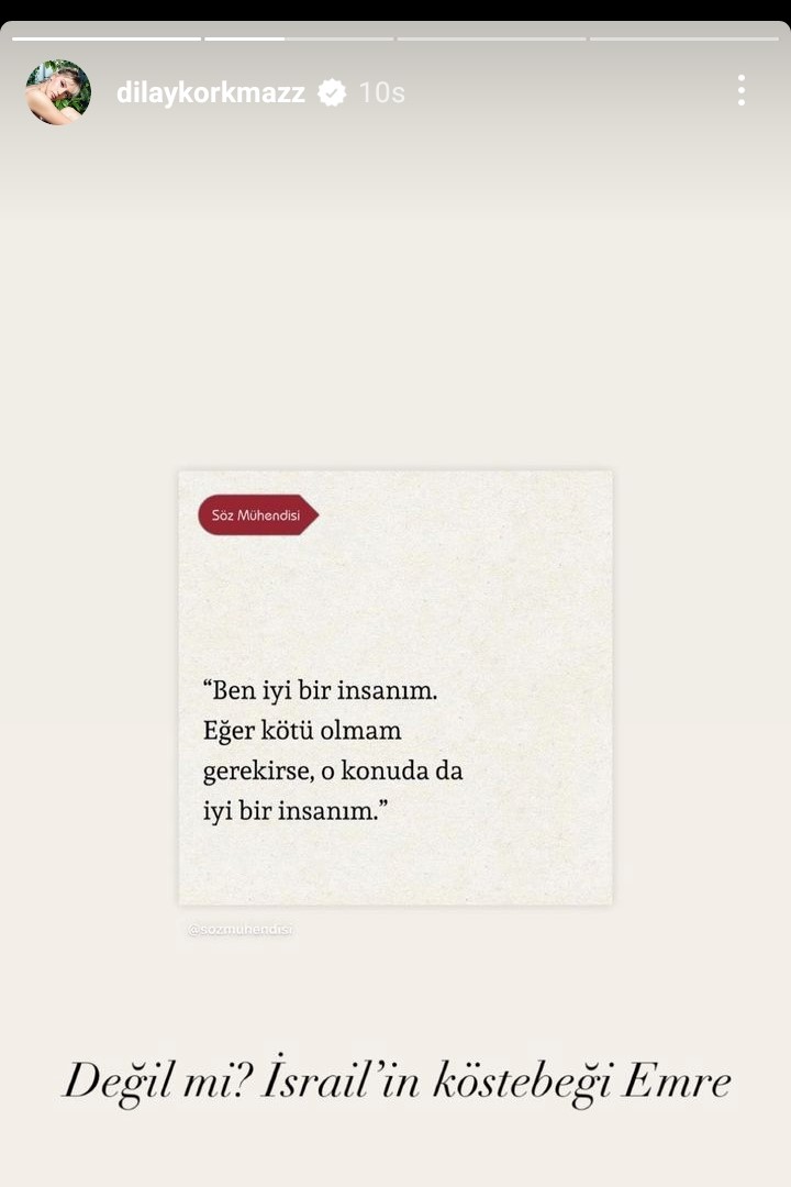 Emre Alp Durmaz ile Dilara Korkmaz'ın da ayrıldığı ortaya çıktı. Dilay Korkmaz'ın, "Ben iyi bir insanım. Eğer kötü olmam gerekirse, o konuda da iyi bir insanım" sözlerini paylaşıp, "Değil mi? İsrail'in köstebeği Emre" yazarak, Emre Alp Durmaz'a gönderme yaptı.