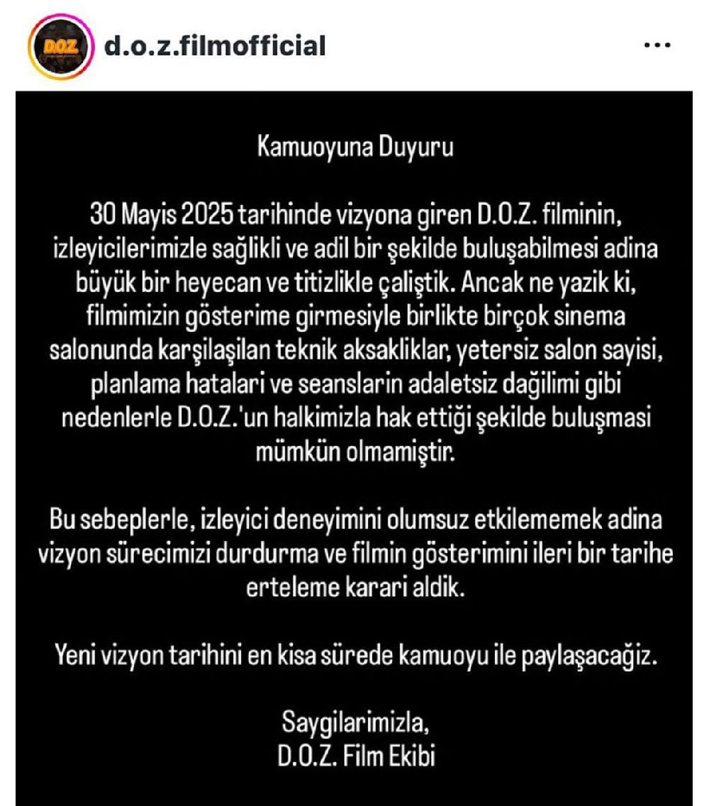 Bu süreçte bize destek olan, anlayışla yaklaşan ve filmimize sahip çıkan tüm izleyicilerimize gönülden teşekkür ederiz. Yeni vizyon tarihini en kısa sürede kamuoyu ile paylaşacağız" dedi.