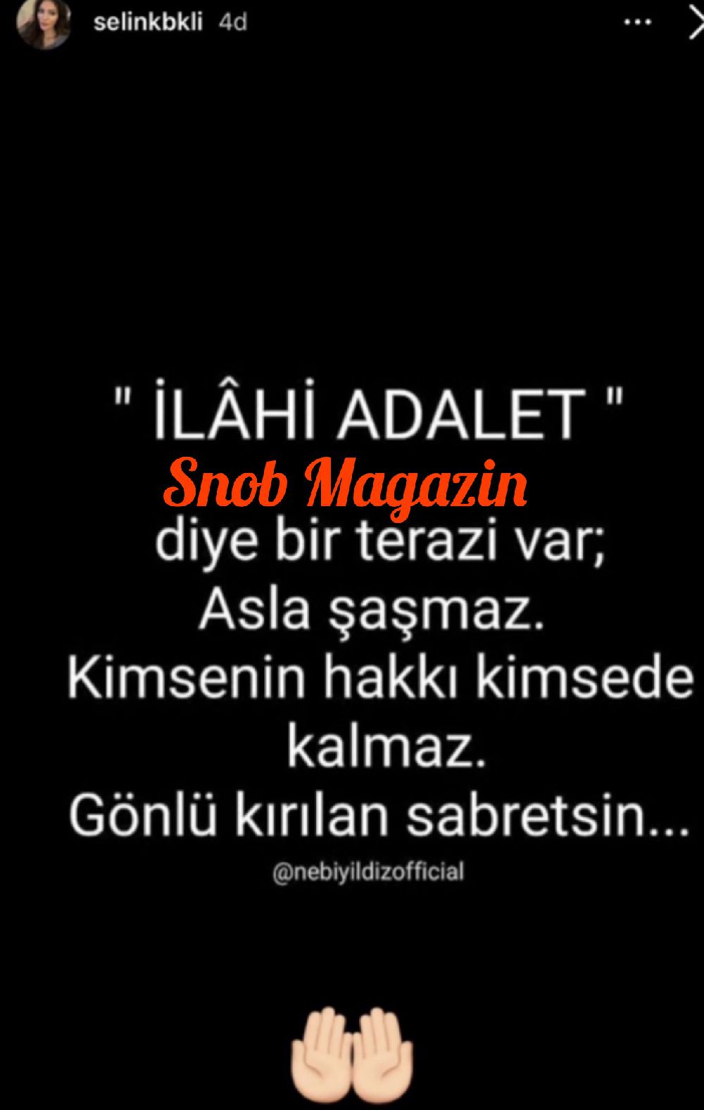 Selin Kabaklı, "İlahi adalet diye bir terazi var. Asla şaşmaz. Kimsenin hakkı kimsede kalmaz. Gönlü kırılan sabretsin..." dedi. Kabaklı, eşi Murat Osman Özdemir'in evliyken Ebru Gündeş ile yasak aşk yaşadığı iddia edilmişti.