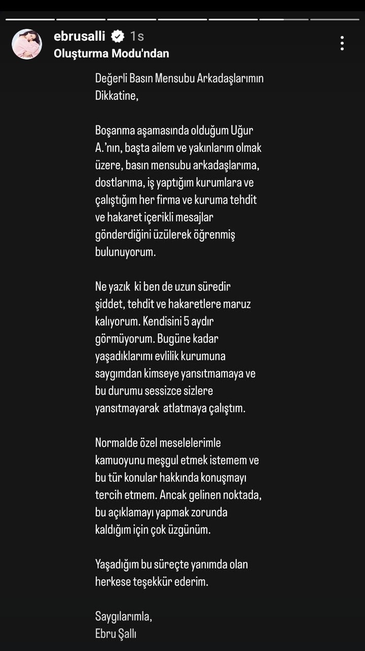Ebru Şallı, boşanma aşamasında olduğu eşi Uğur Akkuş tarafından tehdit edildiğini açıkladı.