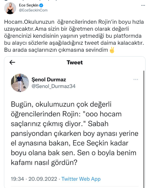 "Hocam.Okulunuzun öğrencilerinden Rojin'in boyu hızla uzayacaktır.Ama sizin bir öğretmen olarak değerli öğrencinizi kendisinin yaşının yetmediği bu platformda bu alaycı sözlerle aşağıladığınız tweet daima kalacaktır. Bu arada saçlarınızın çıkmasına sevindim."