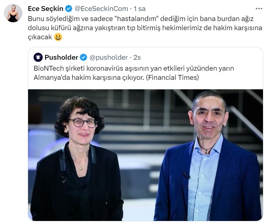 Seçkin, Twitter'da Financial Times'ın, "BioNTech şirketi koronavirüs aşısının yan etkileri yüzünden yarın Almanya'da hakim karşısına çıkıyor" haberini sayfasına taşıdı.