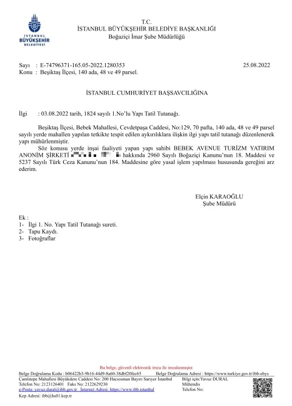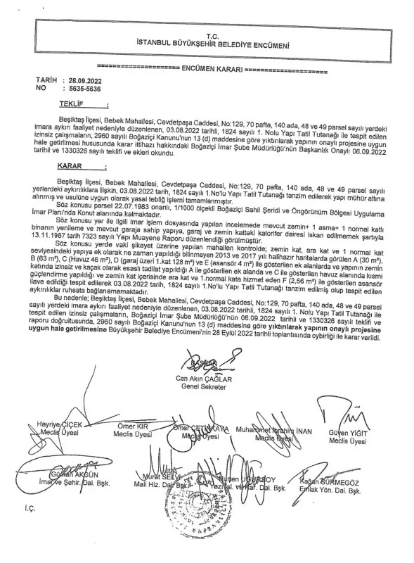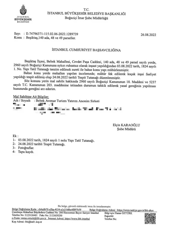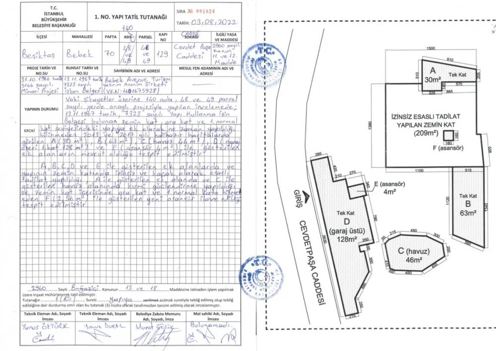 Bunun yanı sıra Boğaziçi İmar Müdürlüğü yapı sahibi hakkında İstanbul Cumhuriyet Savcılığı’na ihbarda bulunduğu ortaya çıktı.