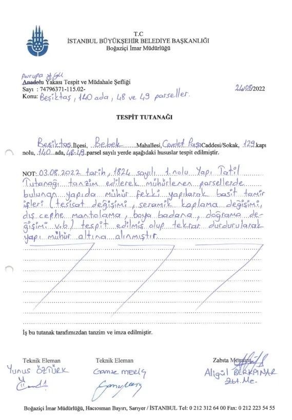 Boğaziçi İmar Şube Müdürlüğü’nün 2 numaralı tadil tutanağına rağmen bu tadilatların hala nasıl devam ettiği soru işareti olmaya devam ediyor. Yeni bir savcılık soruşturması an meselesi gibi görünüyor.
