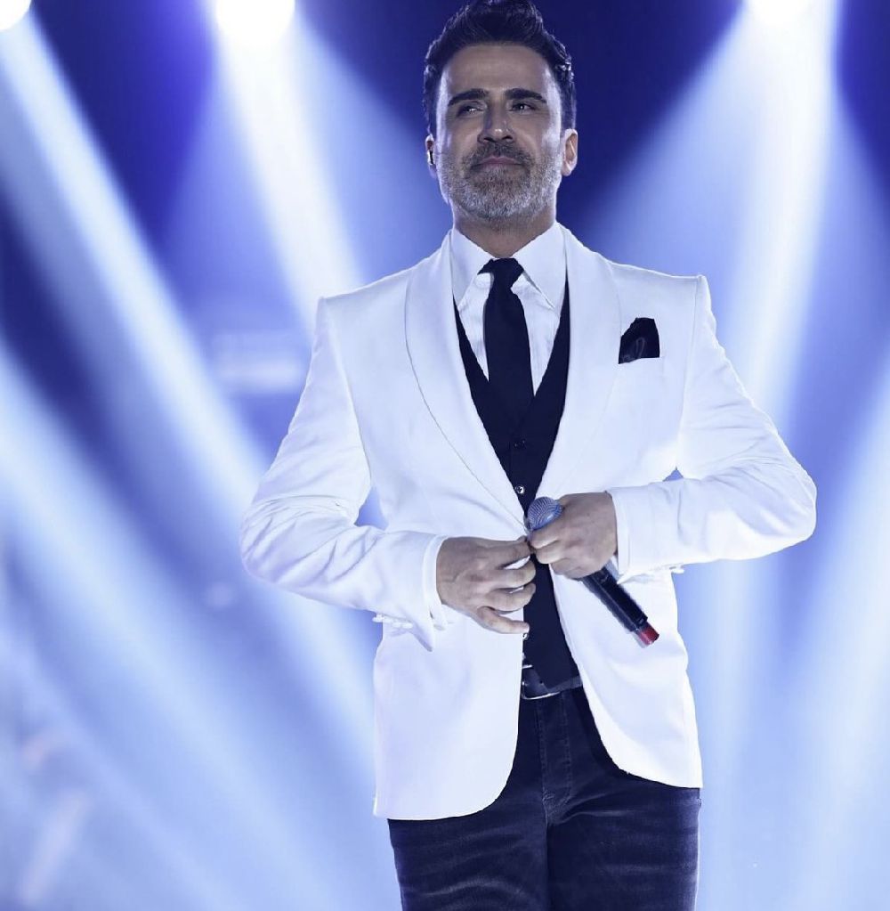 Şarkıcı, siyah takımın altına beyaz spor ayakkabı giydi.
