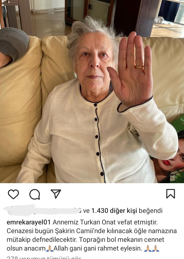 Annesinin karesini paylaşan Karayel, "Annemiz Turkan Onat vefat etmiştir. Cenazesi bugün Şakirin Camii'nde kılınacak öğle namazına mütakip defnedilecektir. Toprağın bol mekanın cennet olsun anacım. Allah gani gani rahmet eylesin" dedi.
