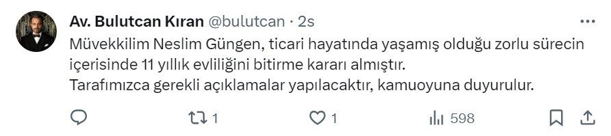 Avukat Bulutcan Kıran, "Müvekkilim Neslim Güngen, ticari hayatında yaşamış olduğu zorlu sürecin içerisinde 11 yıllık evliliğini bitirme kararı almıştır. Tarafımızca gerekli açıklamalar yapılacaktır, kamuoyuna duyurulur" açıklamasını yaptı.