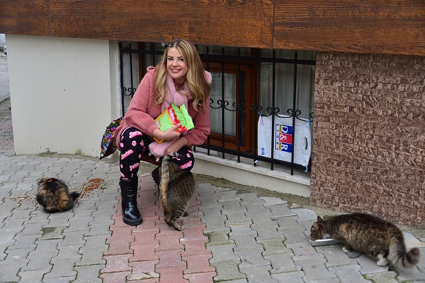 Esra Sönmezer, eline mama alıp sokak hayvanlarını besledi.