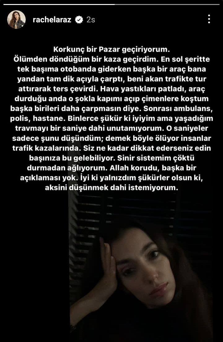 Üç çocuk annesi Araz, "Korkunç bir Pazar geçiriyorum. Ölümden döndüğüm bir kaza geçirdim. En sol şeritte tek başıma otobanda giderken başka bir araç bana yandan tam dik açıyla çarptı. Beni akan trafikte tur attırarak ters çevirdi. Hava yastıkları patladı, araç durduğu anda o şokla kapımı açıp çimenlere koştum başka biri daha çarpmasın diye. Sonrası ambulans, polis, hastane. Binlerce şükür ki iyiyim ama yaşadığım travmayı bir saniye dahi unutamıyorum. O saniyeler sadece şunu düşündüm; demek böyle ölüyor insanlar trafik kazalarında. Siz ne kadar dikkat ederseniz edin başınıza bu gelebiliyor. Sinir sitemim çöktü, durmadan ağlıyorum. Allah korudu, başka bir açıklaması yok. İyi ki yalnızdım şükürler olsun ki, aksini düşünmek dahi istemiyorum" dedi.