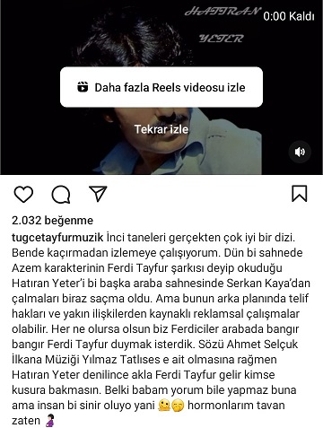 Daha sonraki sahnede ise Serkan Kaya'nın söylemiş olduğu 'Hatıran Yeter' verildi.Bu duruma tepki gösteren Ferdi Tayfur'un kızı Tuğçe Tayfur, "'İnci Taneleri' gerçekten çok iyi bir dizi. Bende kaçırmadan izlemeye çalışıyorum. Dün bi sahnede Azem karakterinin Ferdi Tayfur şarkısı deyip okuduğu 'Hatıran Yeter’i bi başka araba sahnesinde Serkan Kaya’dan çalmaları biraz saçma oldu. Ama bunun arka planında telif hakları ve yakın ilişkilerden kaynaklı reklamsal çalışmalar olabilir. Her ne olursa olsun biz Ferdiciler arabada bangır bangır Ferdi Tayfur duymak isterdik. Sözü Ahmet Selçuk İlkan'a Müziği Yılmaz Tatlıses'e ait olmasına rağmen 'Hatıran Yeter' denilince akla Ferdi Tayfur gelir kimse kusura bakmasın. Belki babam yorum bile yapmaz buna ama insan bir sinir oluyo yani... Hormonlarım tavan zaten" bunları yazdı.