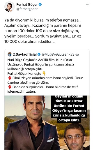 Nuri Bilge Ceylan'ın ödüllü filmi Kuru Otlar Üstüne'de Ferhat Göçer'in şarkısının izinsiz kullanıldığı ortaya çıkmıştı.