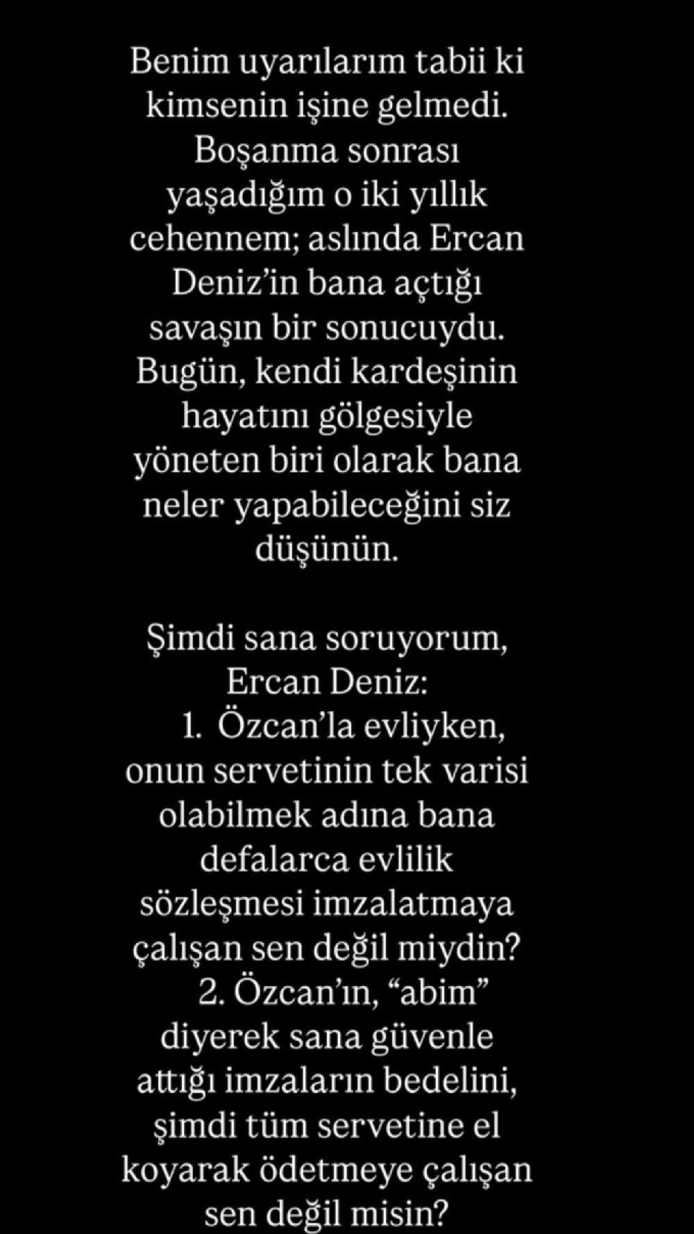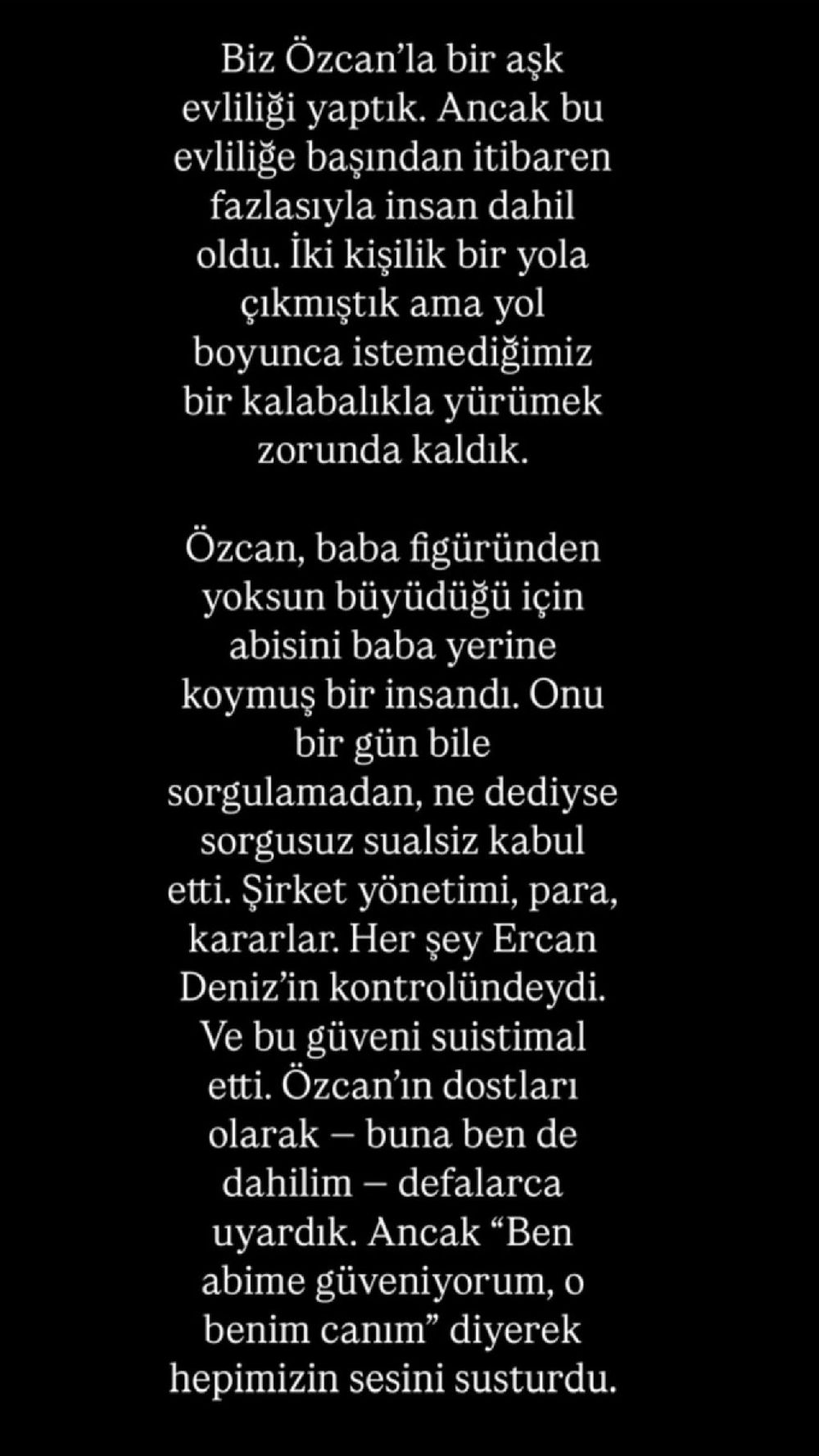 Her şey Ercan Deniz'in kontrolündeydi. Ve bu güveni suistimal etti. Özcan'ın dostları olarak – buna ben de dahilim – defalarca uyardık. Ancak "Ben abime güveniyorum, o benim canım" diyerek hepimizin sesini susturdu.