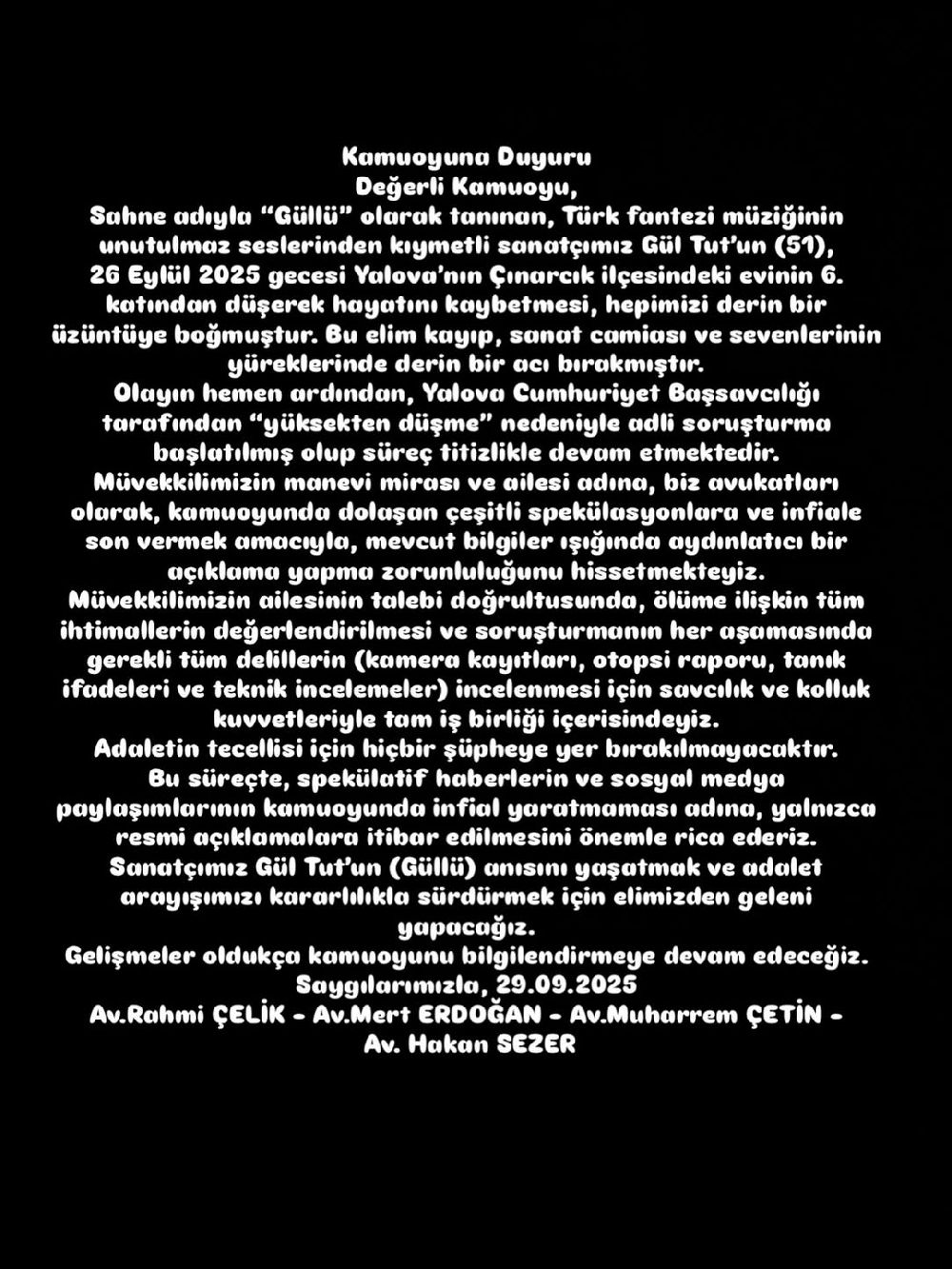 Güllü'nün Yalova Çınarcık'taki evinin balkonundan düşmesinden sonra çıkan haber ve iddialardan sonra şarkıcının avukatlarından açıklama geldi.