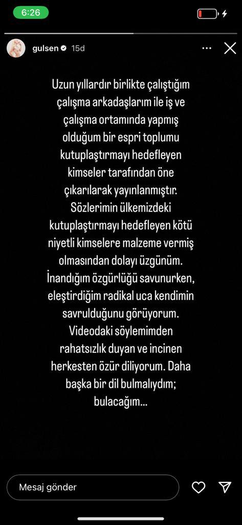 Konİu hakkında sosyal medya hesabından açıklama yapan Gülşen skandal ifadeleri espri olarak nitelendirdi. Gülşen, "Uzun yıllardır birlikte çalıştığım çalışma arkadaşlarım ile iş ve çalışma ortamında yapmış olduğum bir espri toplumu kutuplaştırmayı hedefleyen kimseler tarafından öne çıkarılarak yayınlanmıştır. Sözlerimin ülkemizdeki kutuplaştırmayı hedefleyen kötü niyetli kimselere malzeme vermiş olmasından dolayı üzgünüm. İnandığım özgürlüğü savunurken, eleştirdiğim radikal uca kendimin savrulduğunu görüyorum. Videodaki söylemimden rahatsızlık duyan ve incinen herkesten özür diliyorum. Daha başka bir dil bulmalıydım; bulacağım... " dedi.
