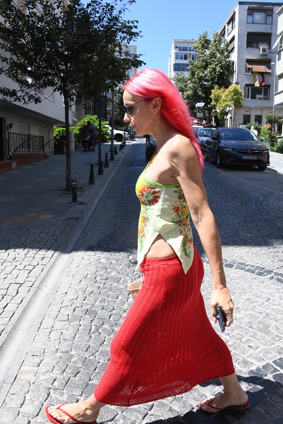 Plaj kombinini andıran giysileri ve sıfır makyajsız haliyle bakışları üzerine toplayan Gülşen, kırmızıya boyadığı saçlarıyla aynı renk eteği ve parmak arası terlikleri ile görenlere "Gülşen tatil modundan çıkamamış adeta plajdan çıkıp gelmiş" dedirtti.