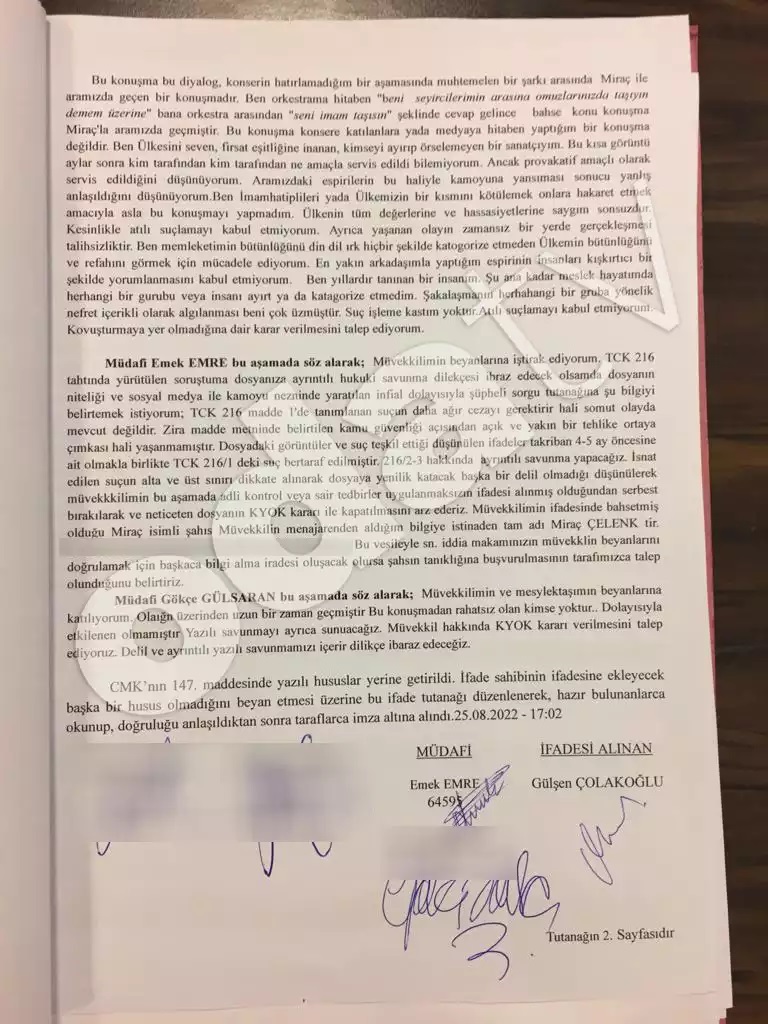 Ünlü şarkıcı ifadesinde, “Ben imamhatiplileri ya da ülkemizin bir kısmını kötülemek onlara hakaret etmek amacıyla asla bu konuşmayı yapmadım” dedi.