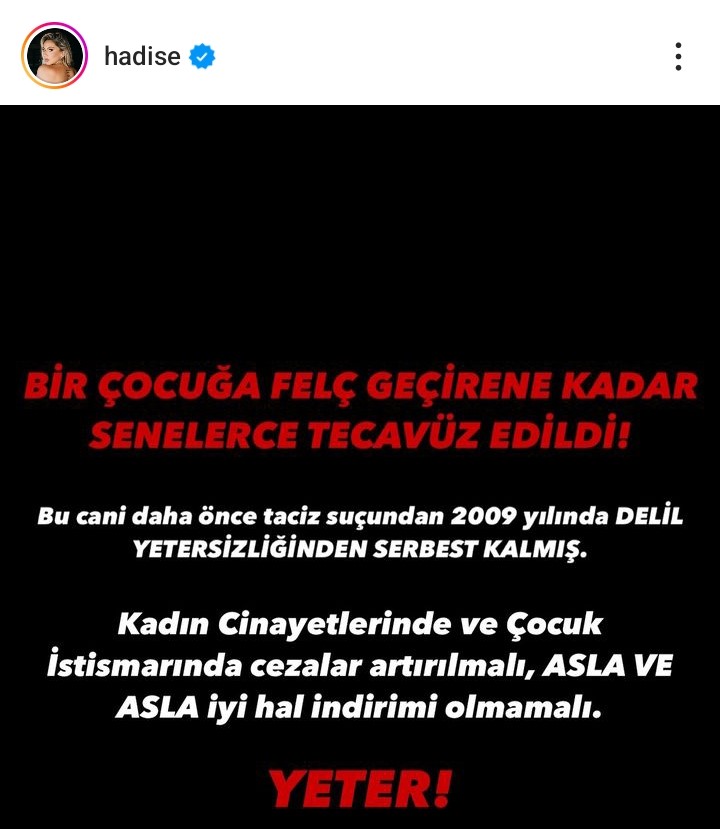 Hadise, "Yıllar önce canlı yayında Özgecan için adelet isterken yasaların değişmesi gerektiğini kadın cinayetleri ve çocuklara uygulanan istismarlara çok daha ağır cezalar verilemesi gerektiğini söylemiştim. Yıllar geçti değişen tek şey vahşetin boyutu oldu! Daha fazla kadın öldü, daha fazla çocuk tecavüze uğradı! Yıllar boyu, sayısı belli olmayan sayıda çocuğa tecavüz eden bir sapık, korkusuzca bunları yapıyorsa ortada büyük bir yanlış var demektir! Bu sapıkları, katilleri “bana bir şey olmaz” kafasından çıkartıp gereken cezaları verdiğimiz an o zaman başarmış olacağız! Bir insan olarak en ağır ama en ağır cezayı almasını istiyorum! Çok üzgünüm" dedi.