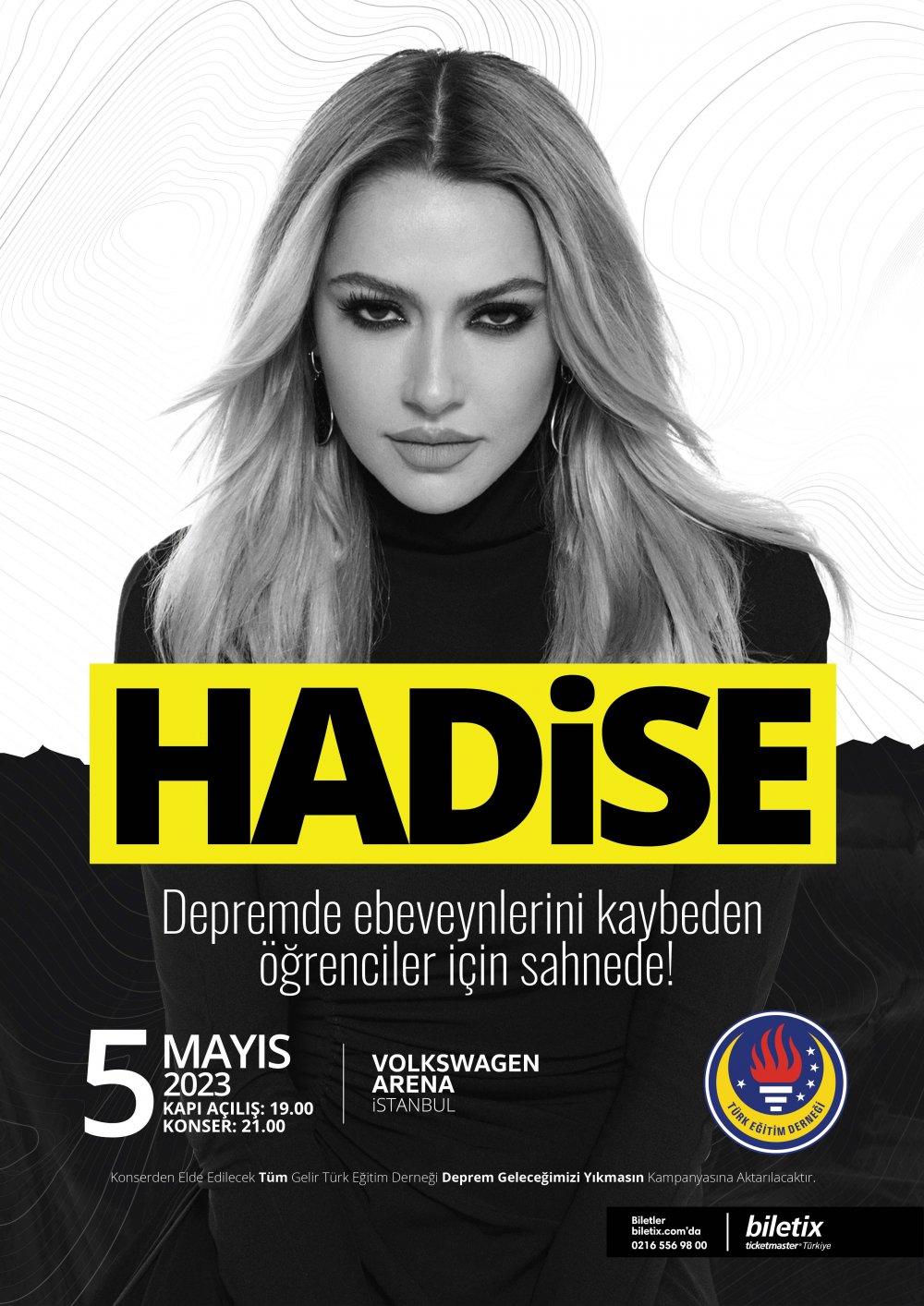 Kariyeri boyunca uluslararası da pek çok sosyal sorumluluk projelerinde gönüllü olarak görev alan Hadise, her dönem başarıları ile Türk pop müziğinin başını çeken grubun içinde yer aldı. Sahne performansı ve şarkıları ile fark yaratan Türk pop müziğinin en güçlü kadın temsilcilerinden Hadise, 5 Mayıs gecesi Volkswagen Arena’da bu defa vereceği konserin tüm gelirini eğitime katkı sağlamak amacıyla Türk Eğitim Derneğine bağışlayacak.