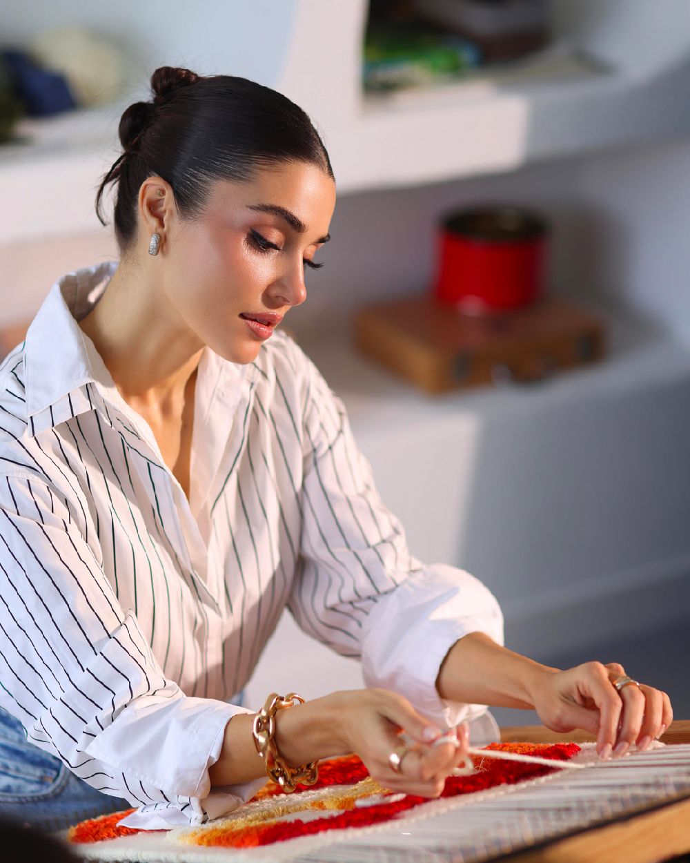 Mimar Sinan Üniversitesi Güzel Sanatlar Fakültesi'nde eğitime devam eden Hande Erçel, bir marka için halı dokudu.
