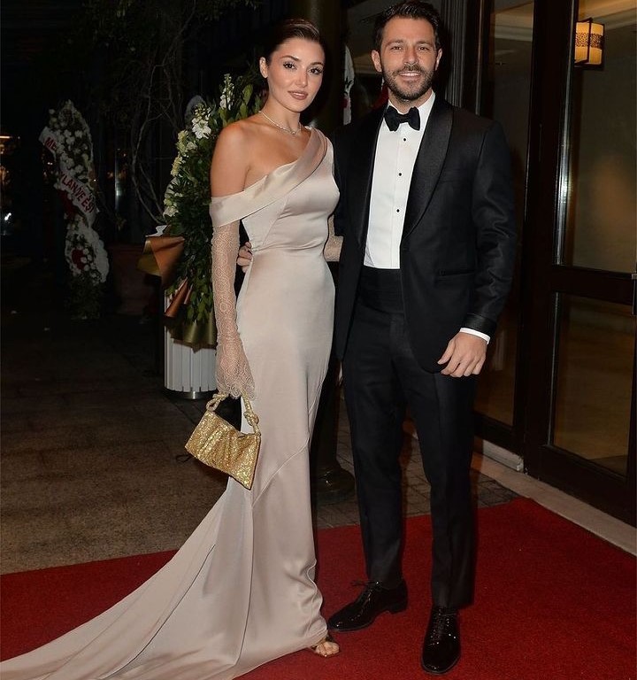 Ünlü çift Hande Erçel ile Hakan Sabancı arkadaşlarının düğününe katıldı. Çift, düğünden önce gazetecilere poz verdi.