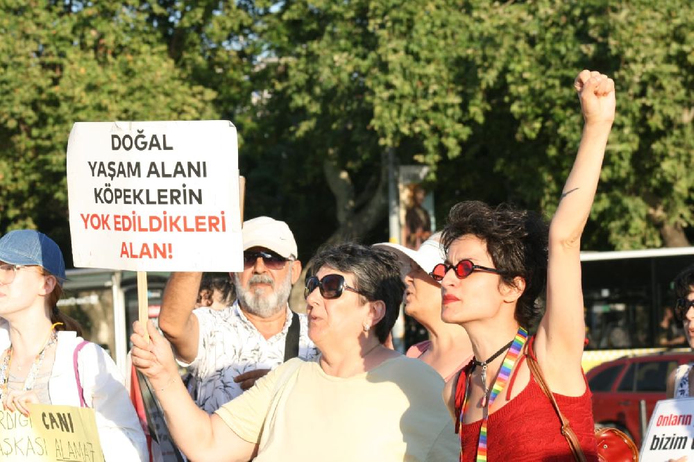“Dostlarımızı sizin vahşet planlarınıza teslim etmeyeceğiz! Bizler yaşamdan yana olanlar; kana susamış iktidara, sahte haberlerle toplumu manipüle eden trol ordusuna, kendisine gazeteci deyip meslek etiğini yok sayarak hayvanların yaşam hakkını anketler açarak bir avuç takipçisiyle tartışmaya açanlara, her gün bilimden uzak, yeni nefret söylemleri ile toplumu kutuplaştıranlara, halkın parkını halka kapatanlara, halkın meclisine halkı almayanlara, protesto hakkını engelleyenlere, gözaltına alanlara karşı; hayvanları, sokakta yaşayan köpekleri, kedileri, tüm dostlarımızı savunuyoruz! Savunmaktan vazgeçmeyeceğiz. Bizler buradayız ve hiçbir yere gitmiyoruz. Günbegün çoğalıyor, günbegün güçleniyoruz! Bugün bu alanda bizlerle birlikte dayanışma gösteren hak mücadeleleri onurumuzdur. Her birini dostlukla selamlıyoruz.”