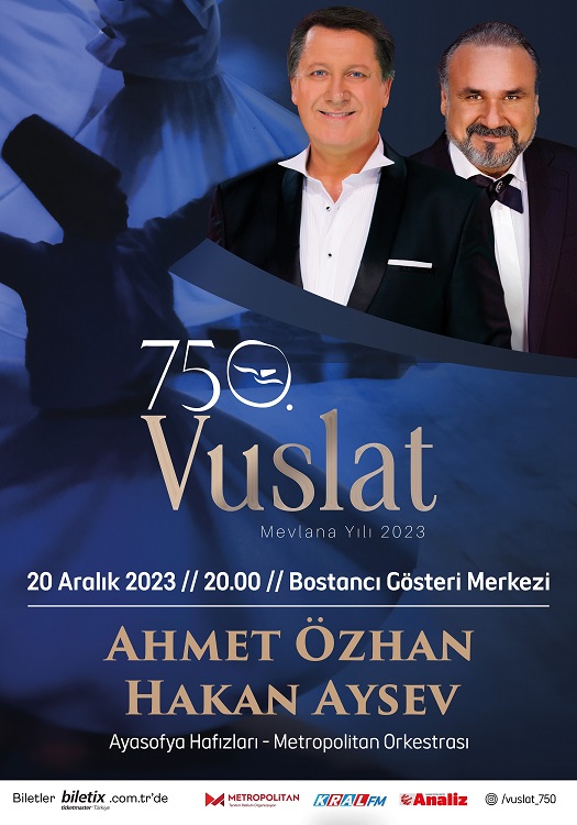 Türk-İslam düşünürü ve mutasavvıf Mevlana Celaleddin-i Rumi, vefatının 750. yılında Türkiye'de ve dünyada çeşitli etkinliklerle yad ediliyor. Bostancı Gösteri Merkezinde 20 Aralık'ta yapılacak "Vuslat 750" etkinliğinde de San Özer yönetimindeki Metropolitan Orkestrası eşliğiyle Ahmet Özhan ve Hakan Aysev ile Ayasofya Hafızları Topluluğunun performansları izleyicilere hem müzik ziyafeti hem de görsel şölen sunacak.