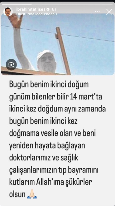 Sanatçı, "Bugün benim ikinci doğum günüm. Bilenler bilir, 14 Mart'ta ikinci kez doğdum. Aynı zamanda bugün benim ikinci kez doğmama vesile olan ve beni yeniden hayat bağlayan doktorlarımız, sağlık çalışanlarımızın Tıp Bayramı'nı kutlarım. Allah'ıma şükürler olsun" dedi.