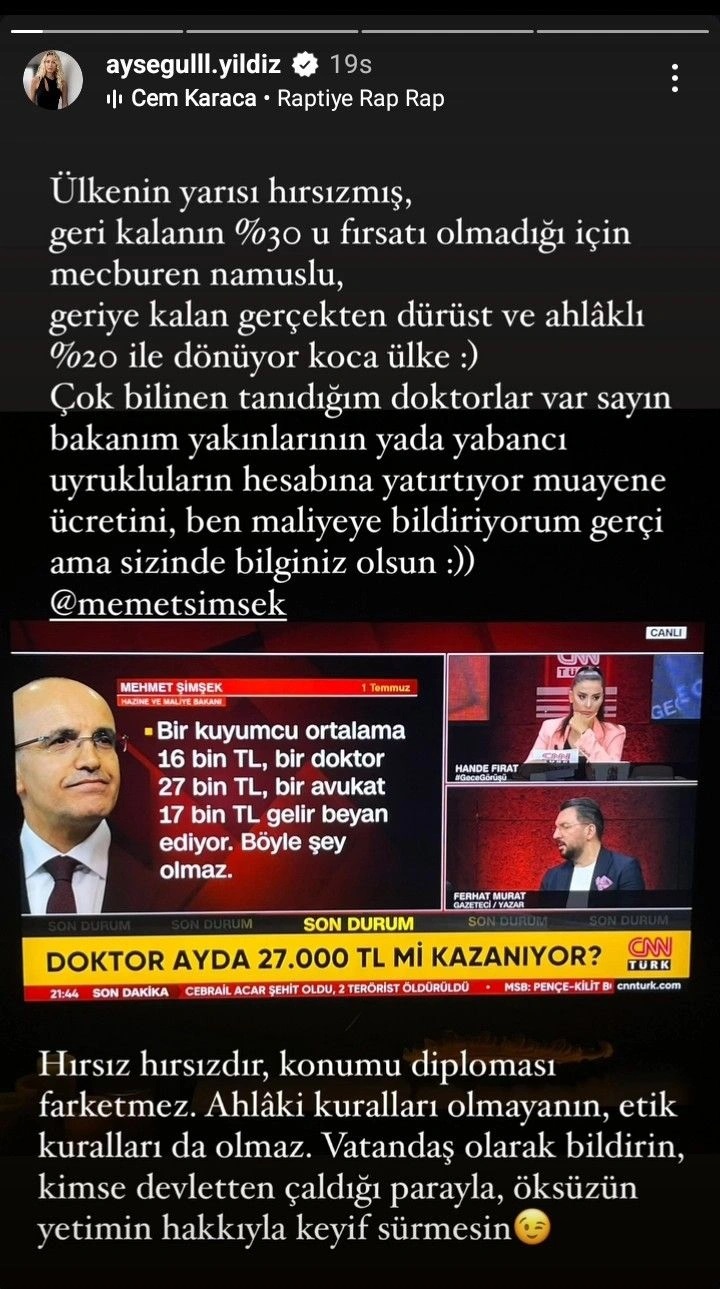 Bakan Mehmet Şimşek'in verdiği rakamları da paylaşan Yıldız "Ülkenin yarısı hırsızmış, geri kalanın yüzde 30'u fırsat olmadığı için mecburen namuslu, geriye kalan gerçekten dürüst ve ahlaklı yüzde 20 ile dönüyor koca ülke" diyerek tepki gösterdi.