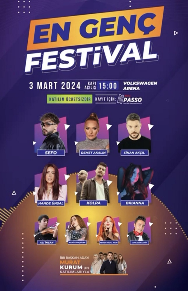 Davetiyeleri passolig platformunda ücretsiz olarak sunulan gençlik festivali müzik ve sanat tutkunlarını unutulmaz bir deneyime davet ediyor. İstanbul Büyükşehir Belediye Başkan adayı Murat Kurum'unda katılacağı etkinlikte sahnede; Sefo, Demet Akalın, Hande Ünsal, Sinan Akçıl, Kolpa, Brianna, Feride Hilal Akın, Ali İnsan, Rabia Tunçbilek gibi ünlü sanatçılar yer alacak.