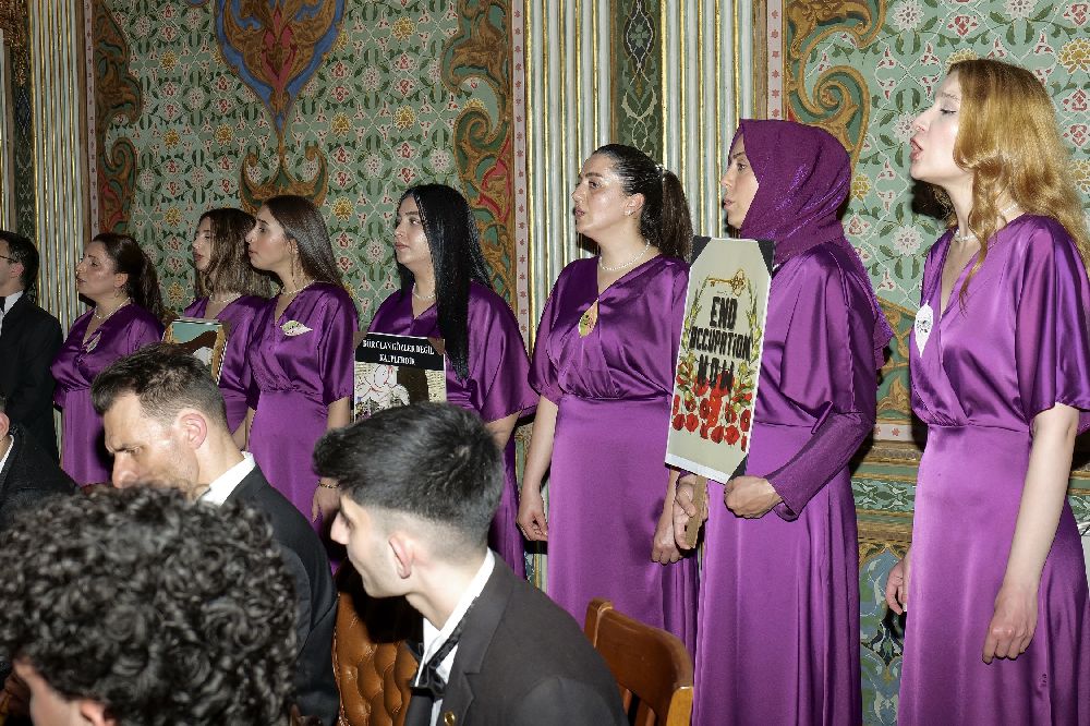 Konserin finalinde, Gazze ve Filistin'e adanmış özel besteler seslendiren öğrenciler, sahnede anlamlı bir mesaj verdi. İzleyicilerin duygusal anlar yaşadığı konserin sonunda, öğrenciler özel olarak hazırlanan pankartlarla Gazze'ye desteklerini dile getirdi. Ayrıca, ebru sanatının ustası Hikmet Barutçugil'in hazırladığı Filistin rozetlerini takarak sanatın farklı bir formuyla da dayanışma gösterdiler.