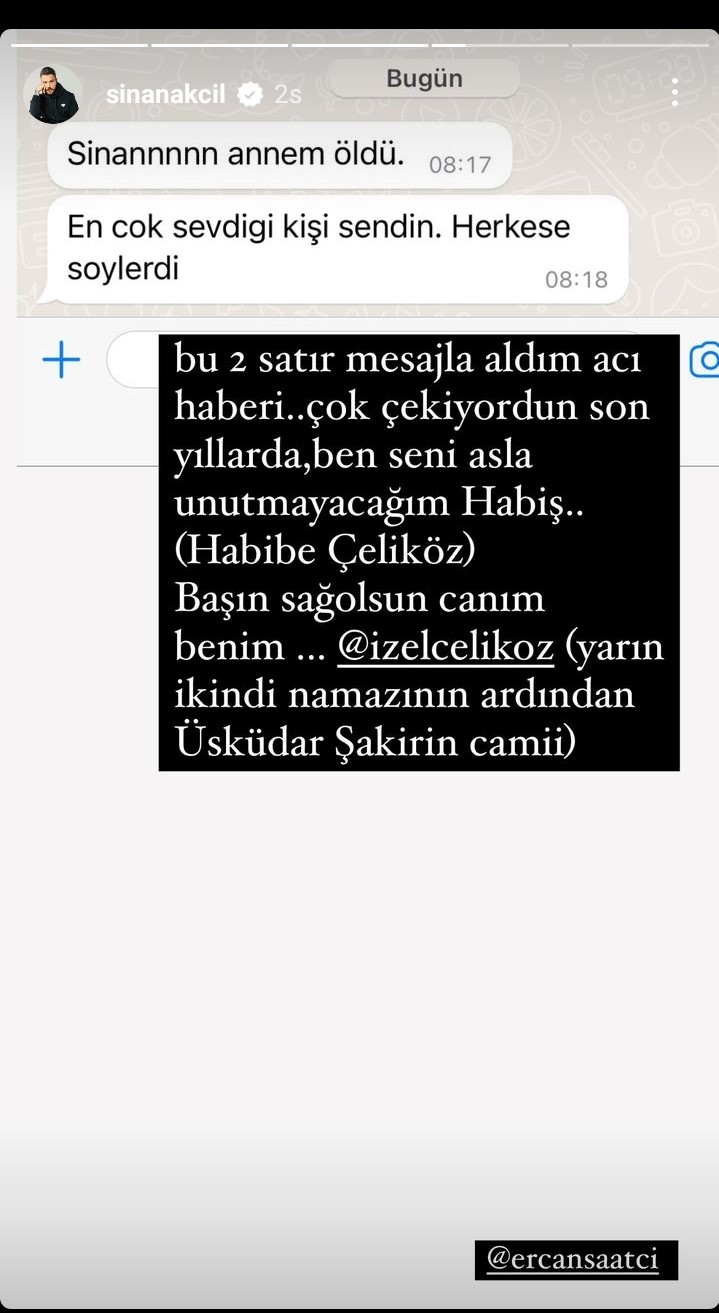 İzel'in annesi Habibe Çelikgöz hayata gözlerini kapadı. İzel kötü haberi arkadaşı Sinan Akçıl'a attığı mesaj ile duyurdu.