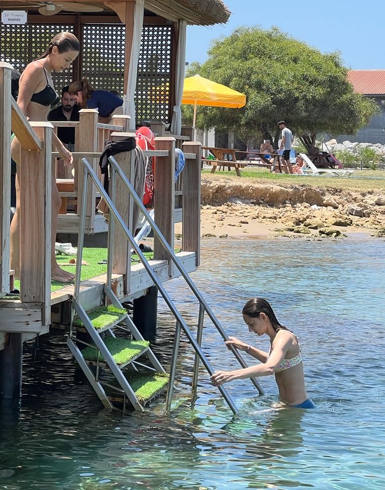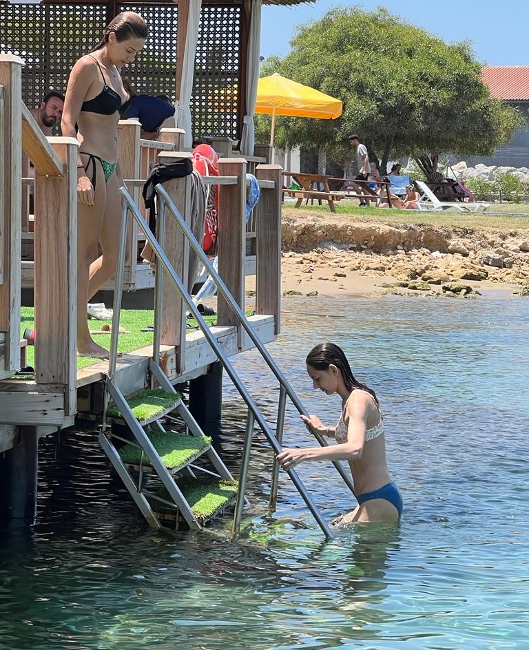 Uzun süre denizde kalarak bol bol sohbet eden oyuncuların keyfi yerindeydi. Fit halleri ve düzgün fizikleriyle göz dolduran yakın arkadaşlar denizden beraber çıkarak localarına geçtiler. Gündüz deniz keyfi yapan oyuncular akşam vakti gazetecilerle bir araya geldi.